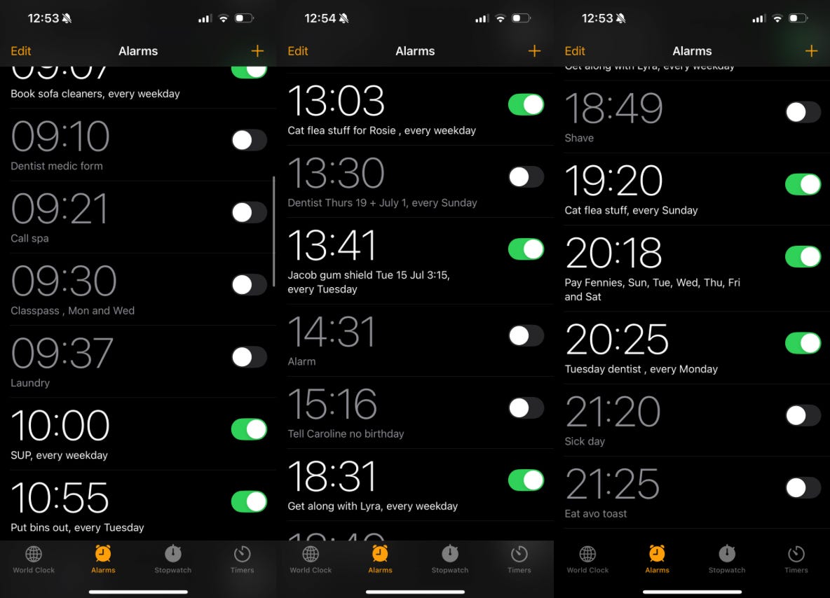 Spammy alarms (really annoying tasks you’re putting off, like shaving, or returning a bin to B&Q because it’s the wrong shape. Right, so not to get into it but ChatGPT explained to me that a curved edge is ideal for preventing the bag ripping when taking the bins out, which is by far my biggest pain point, but my wife had already bought the rectangle bin because it’s the same one we had before, and I got quite distracted before I could tell her not to, but now we can’t find the receipt and so now we just have a mildly expensive bin in the hallway that we don’t want and can’t return)