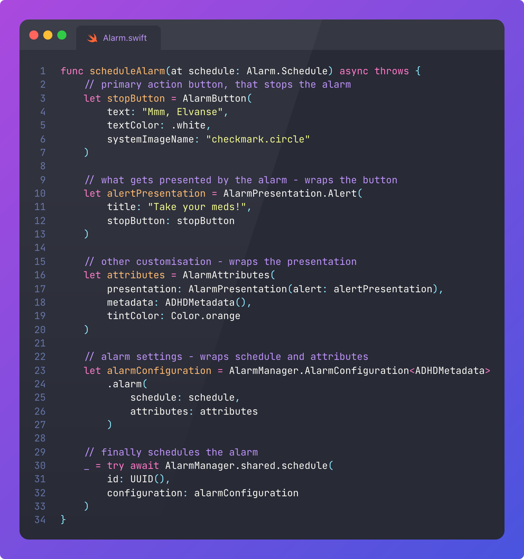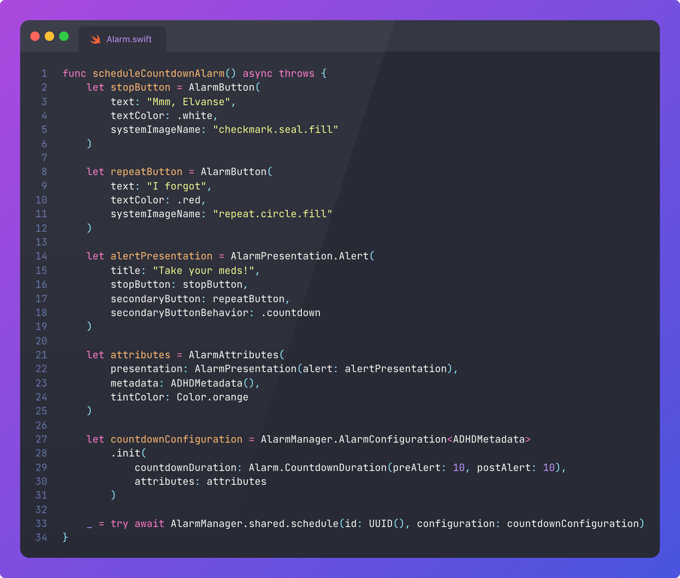 The ADHDMetadata is used to define stuff like icons on a Live Activity or configurable attributes. For now, you don’t really need to do anything other than define an empty structure conforming to AlarmMetadata to set up the AlarmAttributes.