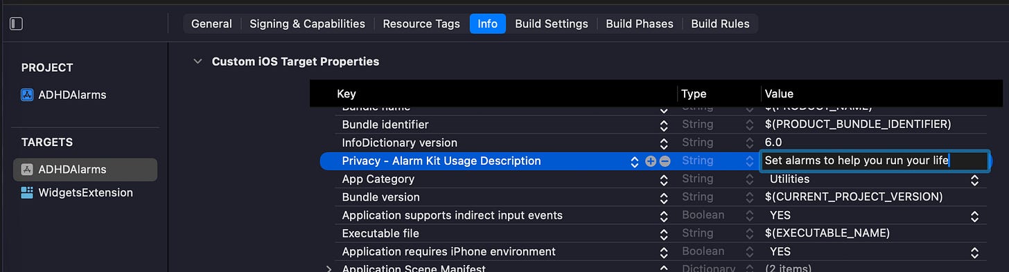First we set up the usage description in the Info.plist, the NSAlarmKitUsageDescription.
