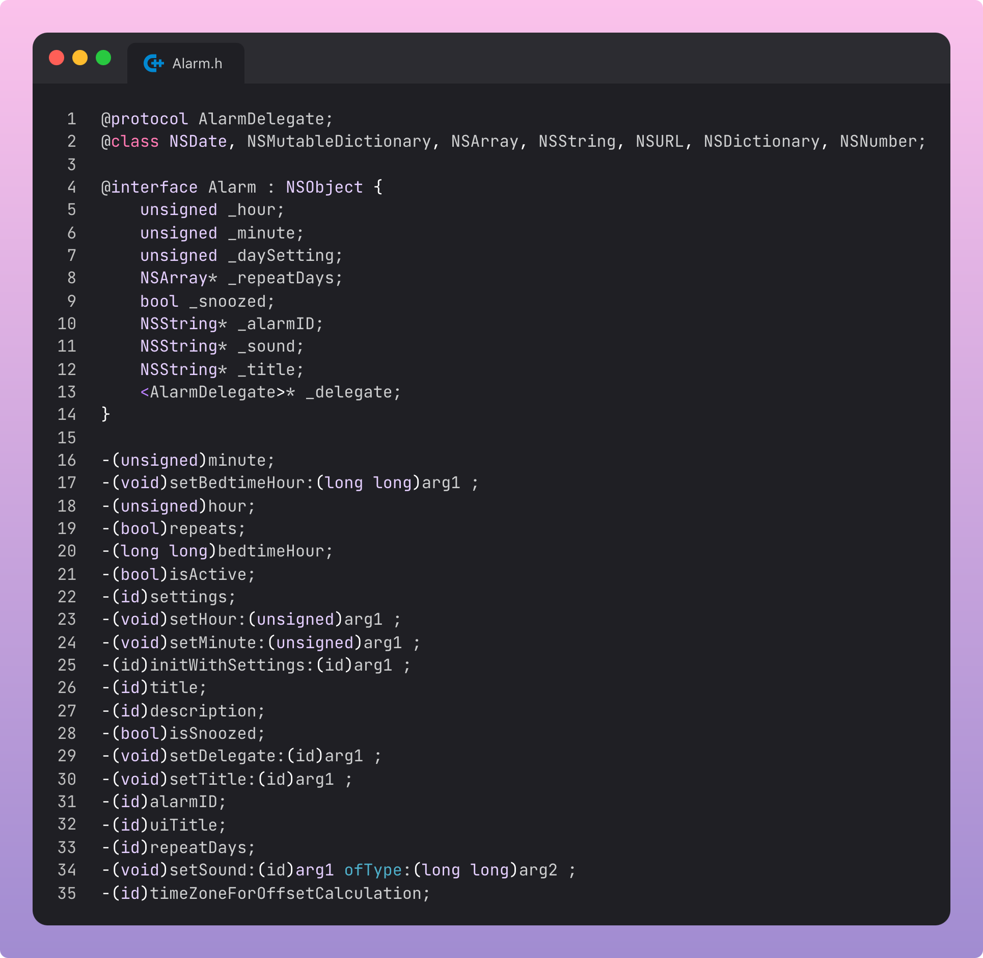 When using classdump-dyld or RuntimeBrowser, the full header interface for the alarms can be generated into a header file, Alarm.h.