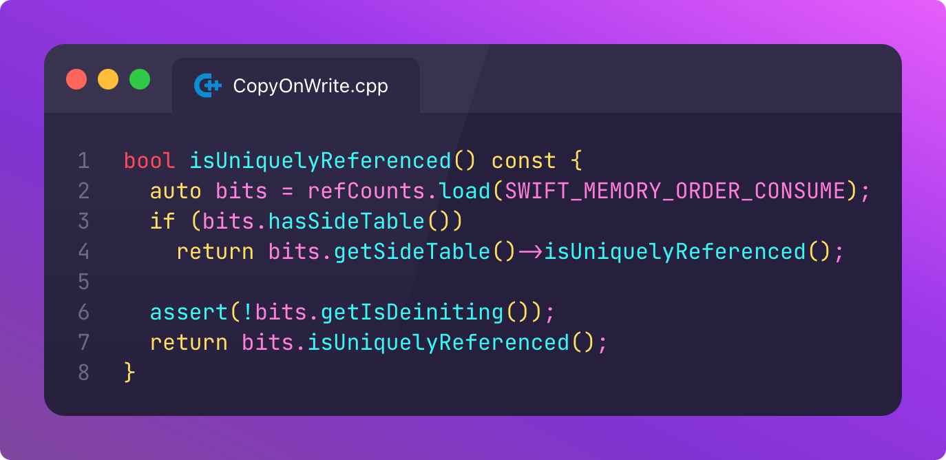 This refCount struct has an isUniquelyReferenced() property. For this uniqueness check, we safely load the memory into the bits property and ask if it’s uniquely referenced.