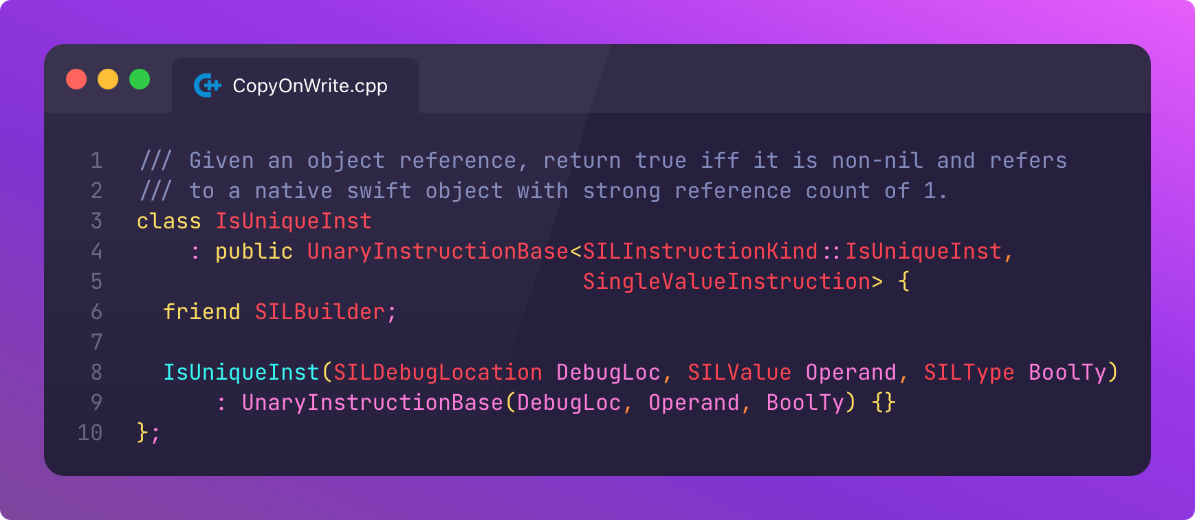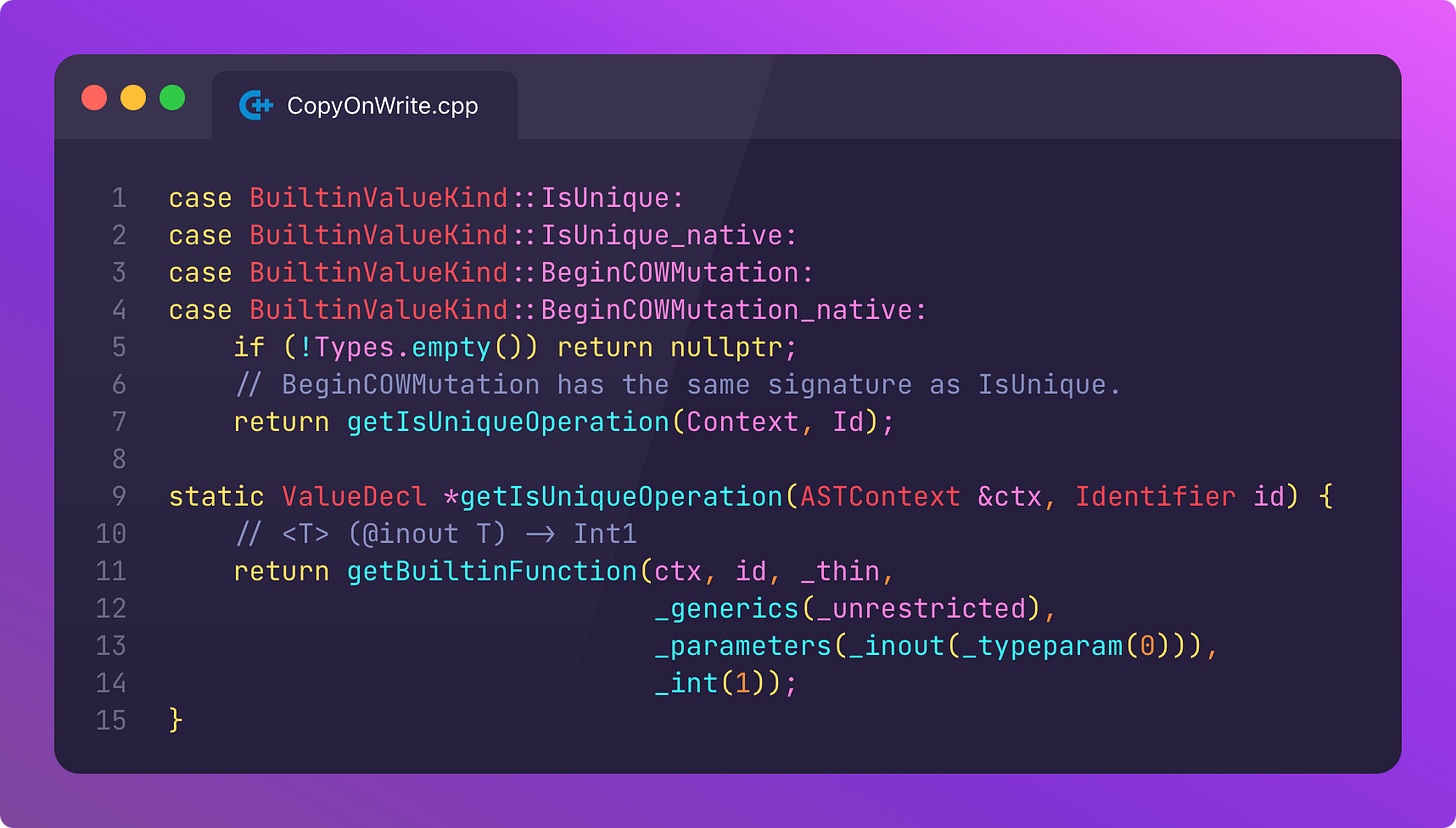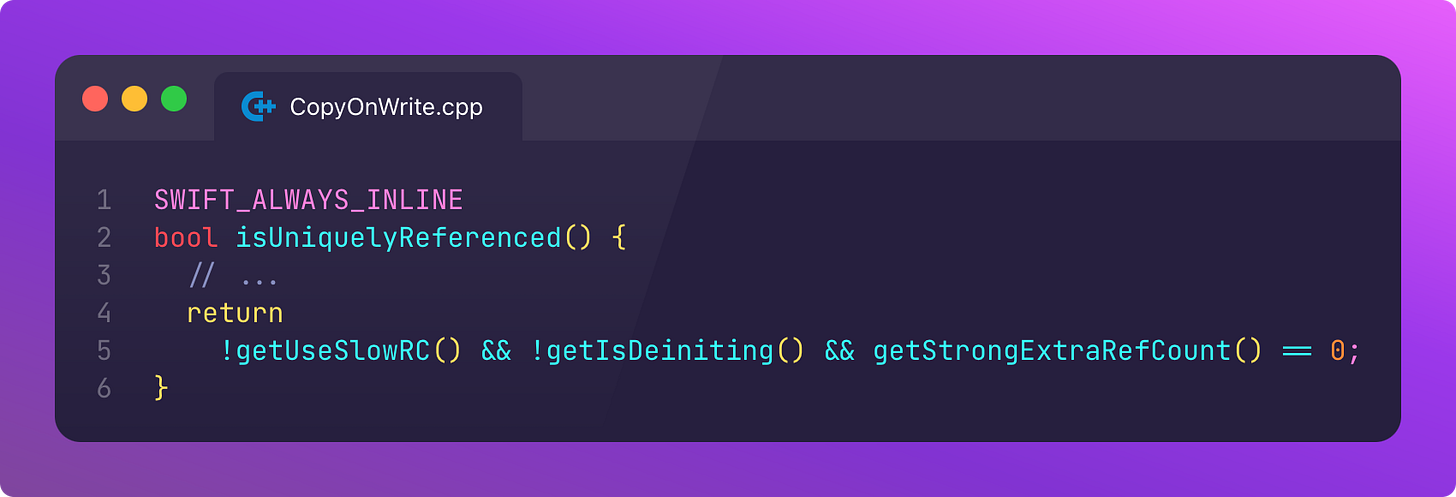 Let’s download the Swift source code, search for isKnownUniquelyReferenced, and take a gander at the implementation.