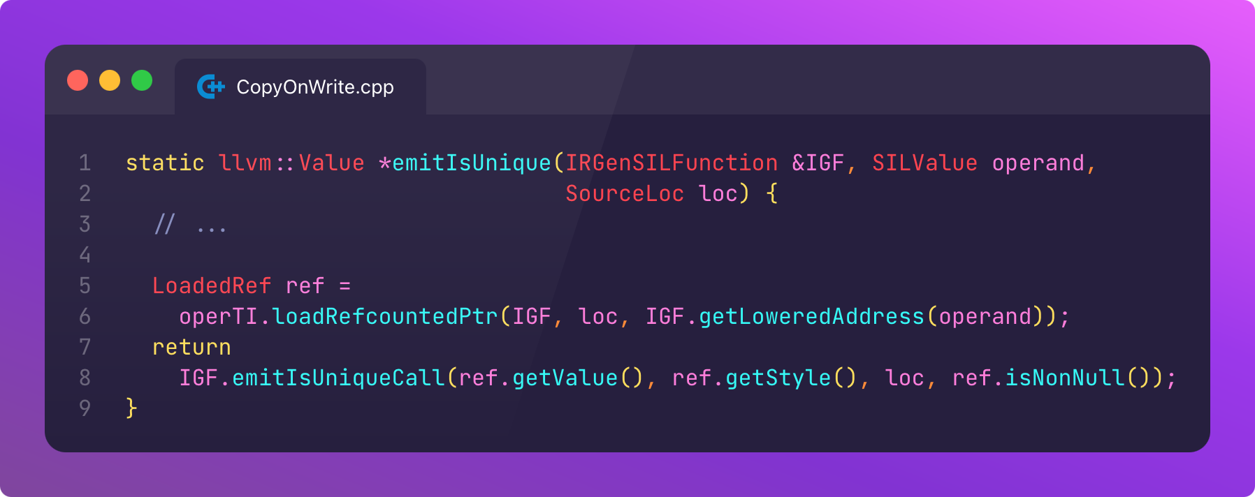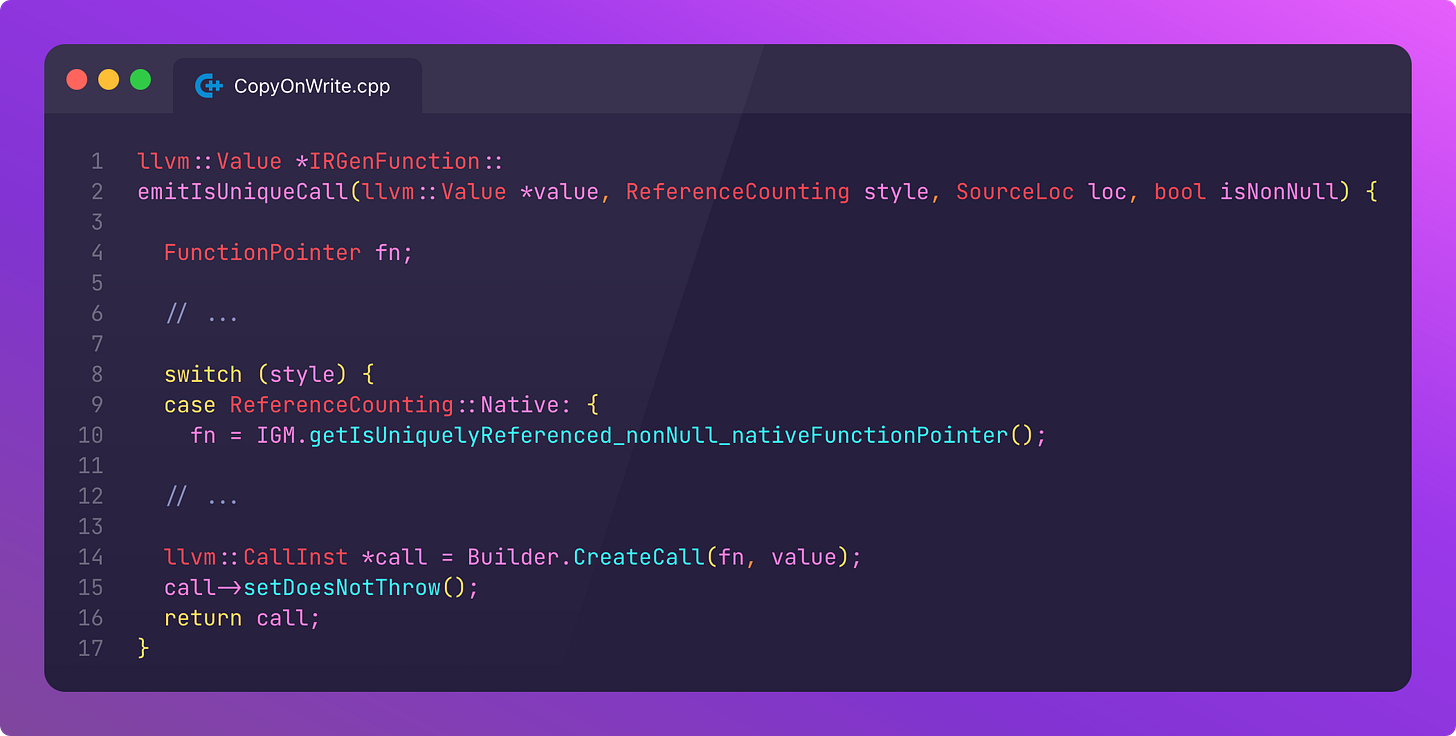 Let’s investigate where the LLVM IR instruction for IGM.getIsUniquelyReferenced_nonNull_nativeFunctionPointer actually ends up.