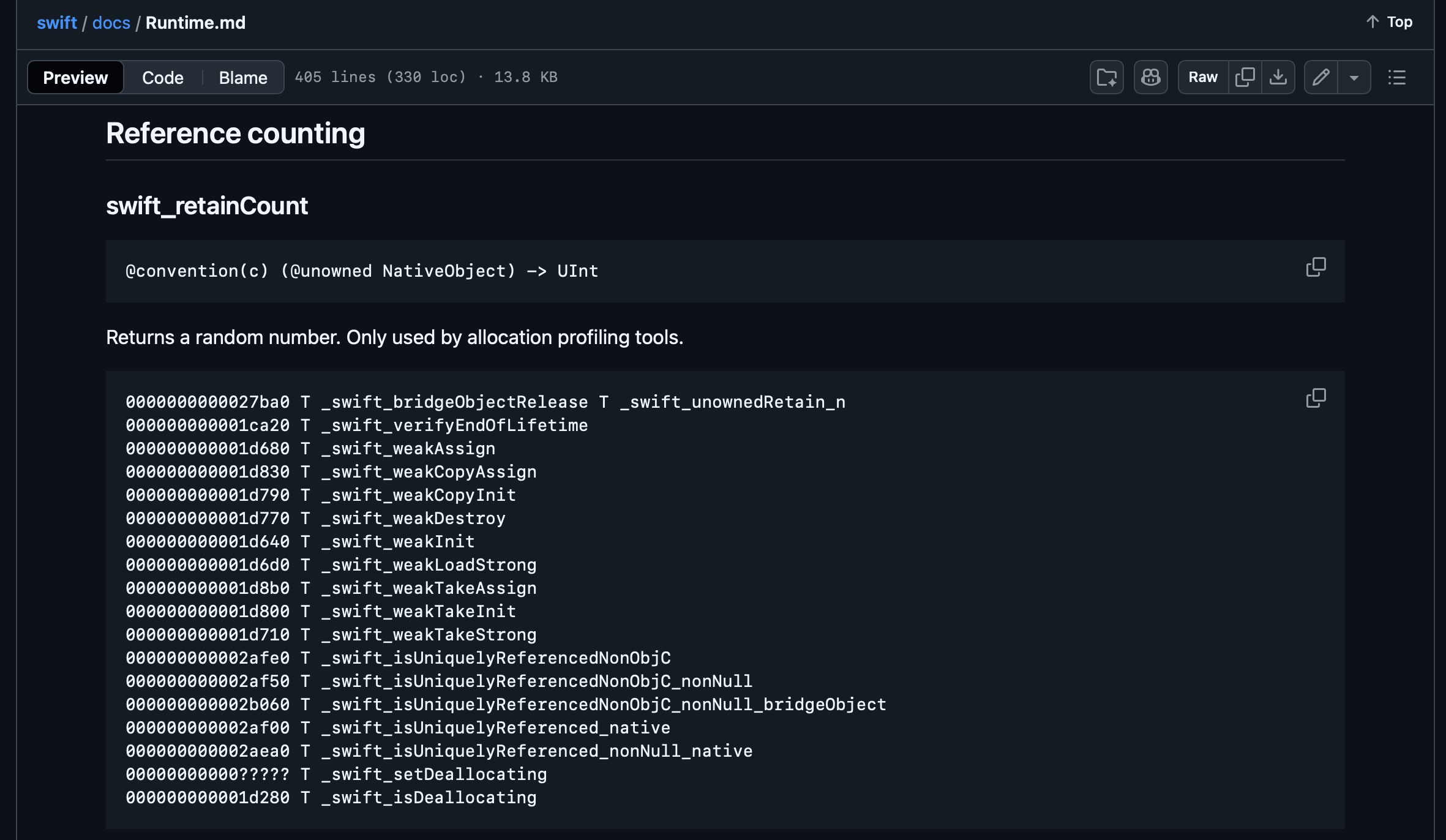 Looking at SwiftObject.mm (an Objective C++ file!), we locate the function that was defined in the ABI: