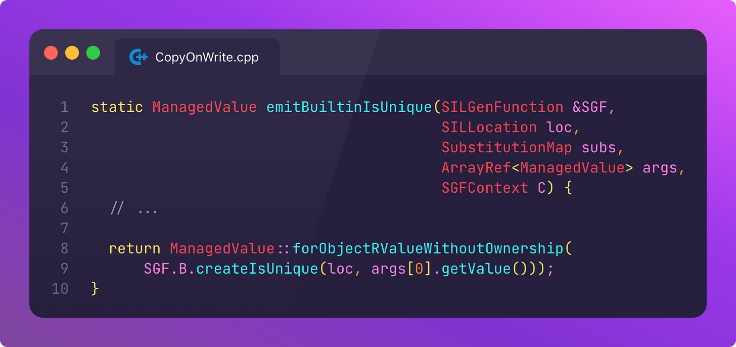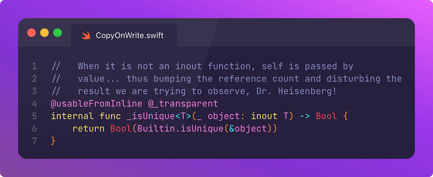 With that substantial segue completed, let’s return to our isKnownUniquelyReferenced deep-dive.