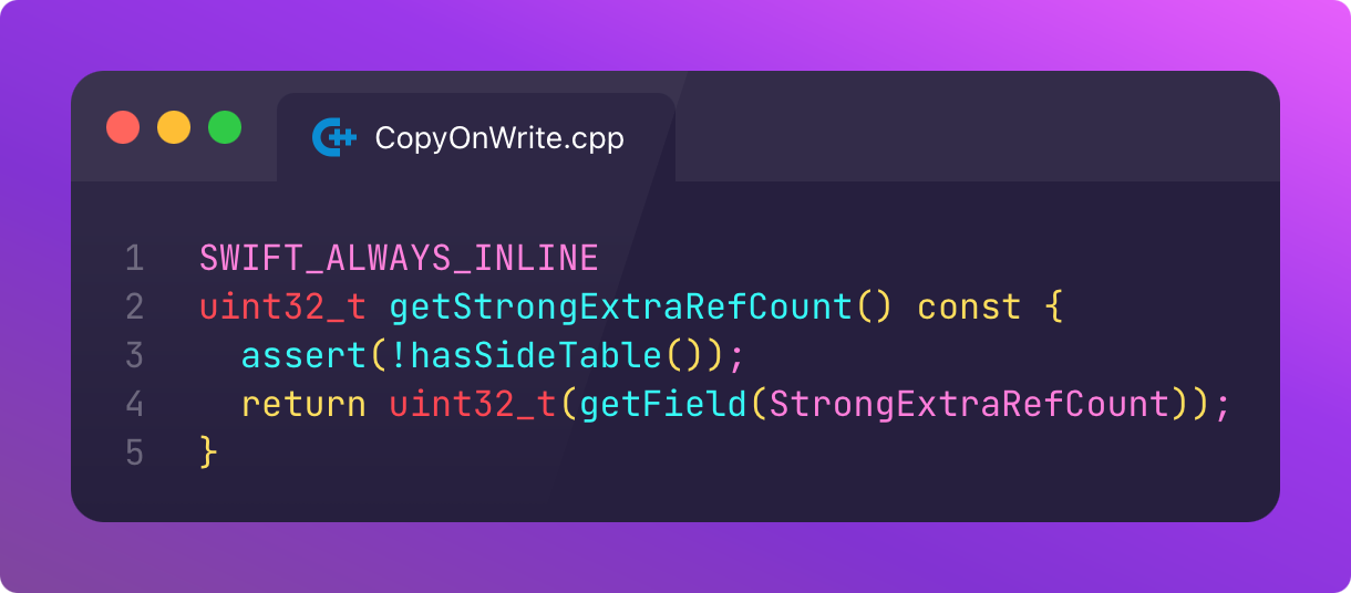If an object has exactly one strong reference (logical), the bits representing the strong reference count are 00000000 (physical). The getStrongExtraRefCount function finds us the strong reference count that we’re looking for, StrongExtraRefCount: