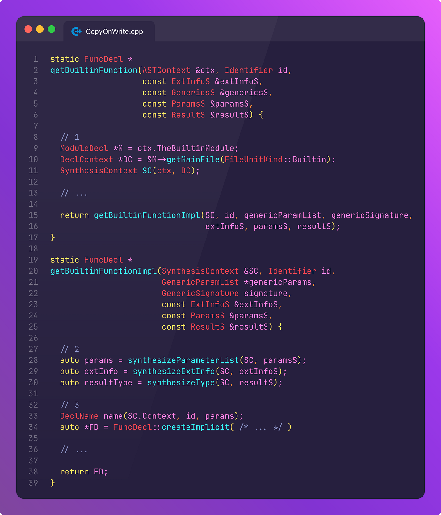 These variants all produce the same getIsUniqueOperation, hung like so many baubles onto the AST (abstract syntax tree). This itself calls getBuiltinFunction to return a pointer to a ValueDecl, which represents a function signature.