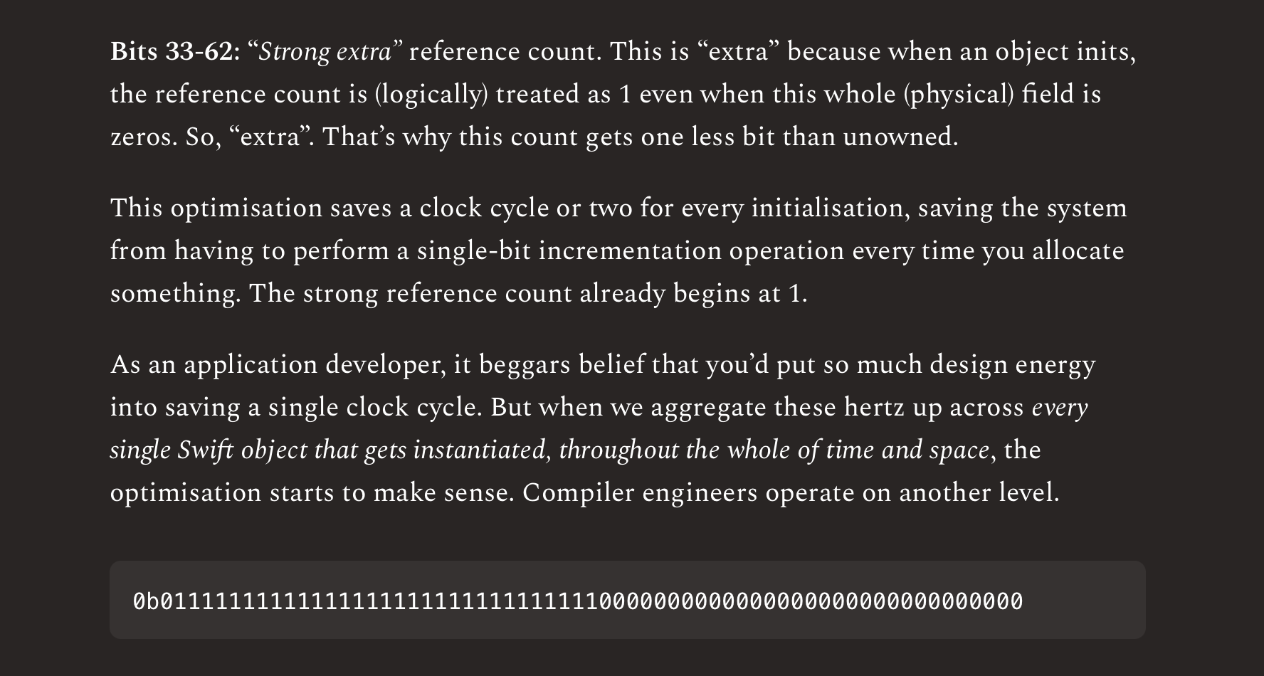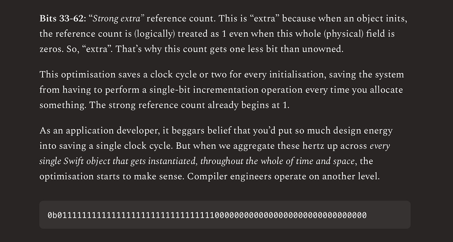 Uh, I also did a ridiculously in-depth deep-dive into reference counting here. Like, I literally look at the bit layout of the refCounts C struct. It’s good, clean fun.