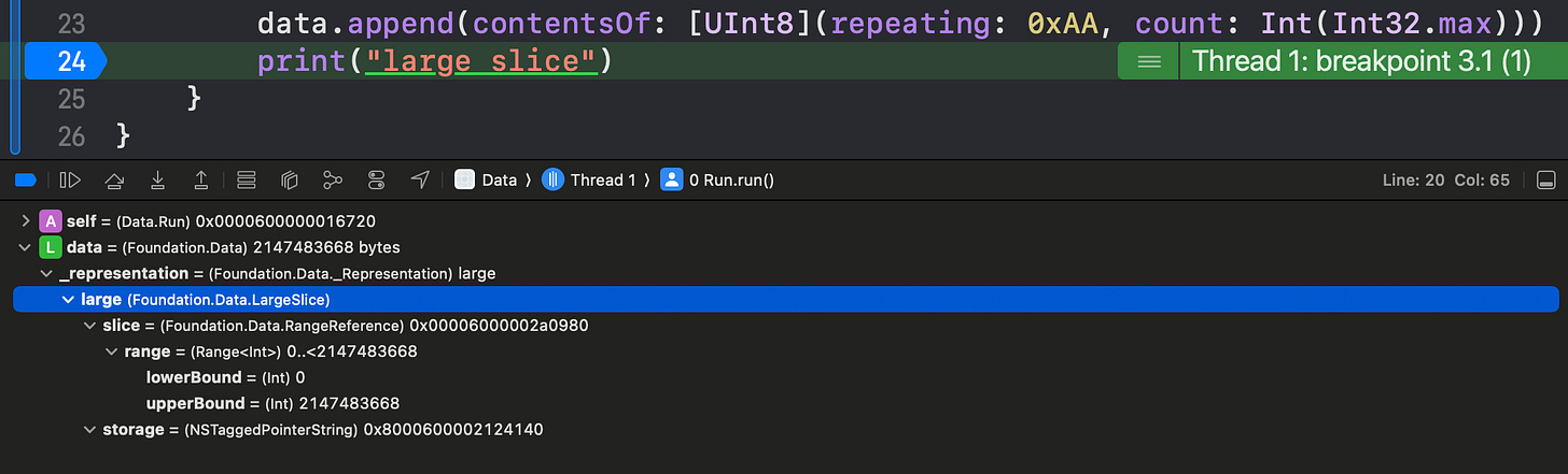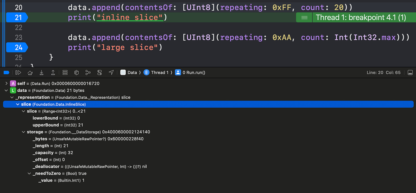 The other property is a slice struct, with a data range of 2 Int32s. These 4-byte “HalfInts” add up to the other 8 bytes in the 2-word memory width of the data representation, allowing the enum to remain inline. This means the maximum range for InlineSlice is Int32.max, or about 2GB.