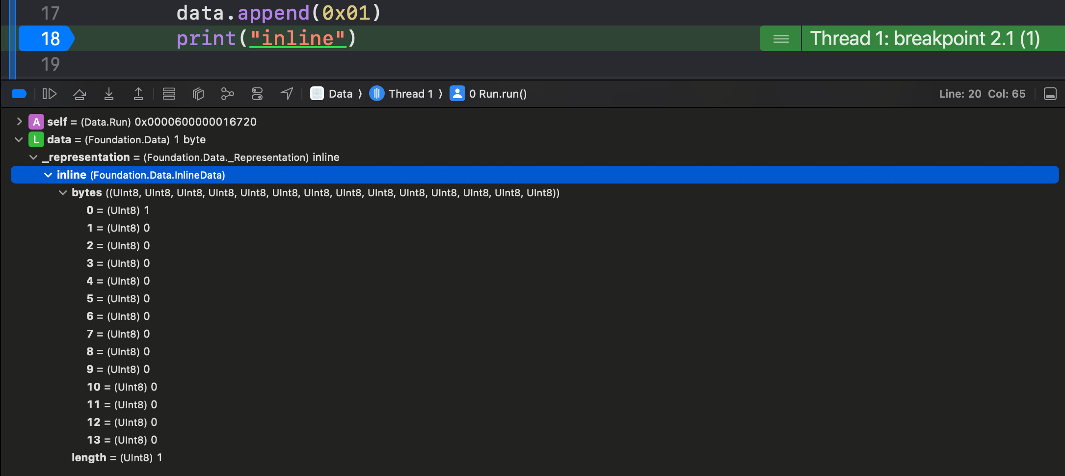 When initialising the data _Representation, Data checks the unsafe pointer to the underlying data, and assesses its size. It selects the most efficient representation which can fit the data, and moves the bytes over to their new home.
