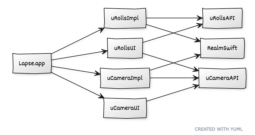 Both the UI and Impl modules import the same API, so we can add data access layer protocols to the API (like CameraDataService and RollsDataService)—therefore our UI module can still contain all the view logic—only the data is swapped out.