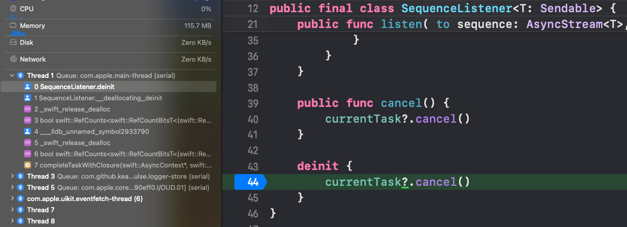 deinitshould be locked to the main actor, however the compiler errors don’t seem to respect this. Maybe things will be better in Swift 6 🤷♂️To learn more about Task threading gotchas, check out why is my Task running on the main thread?
