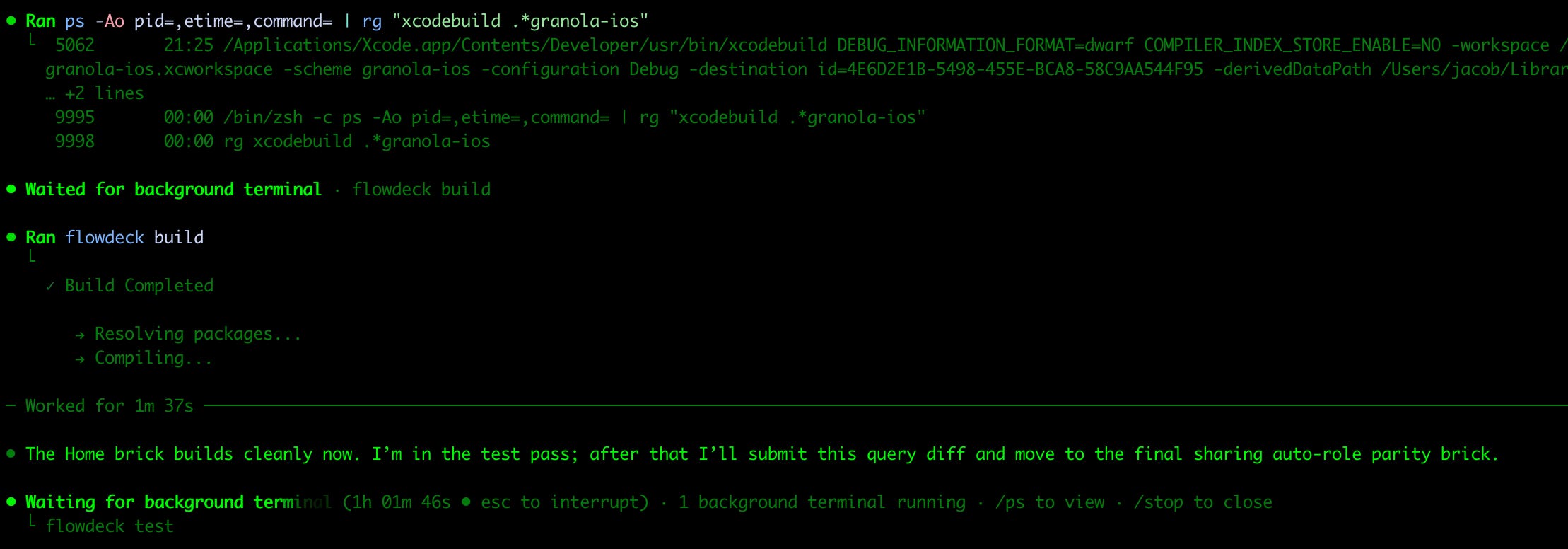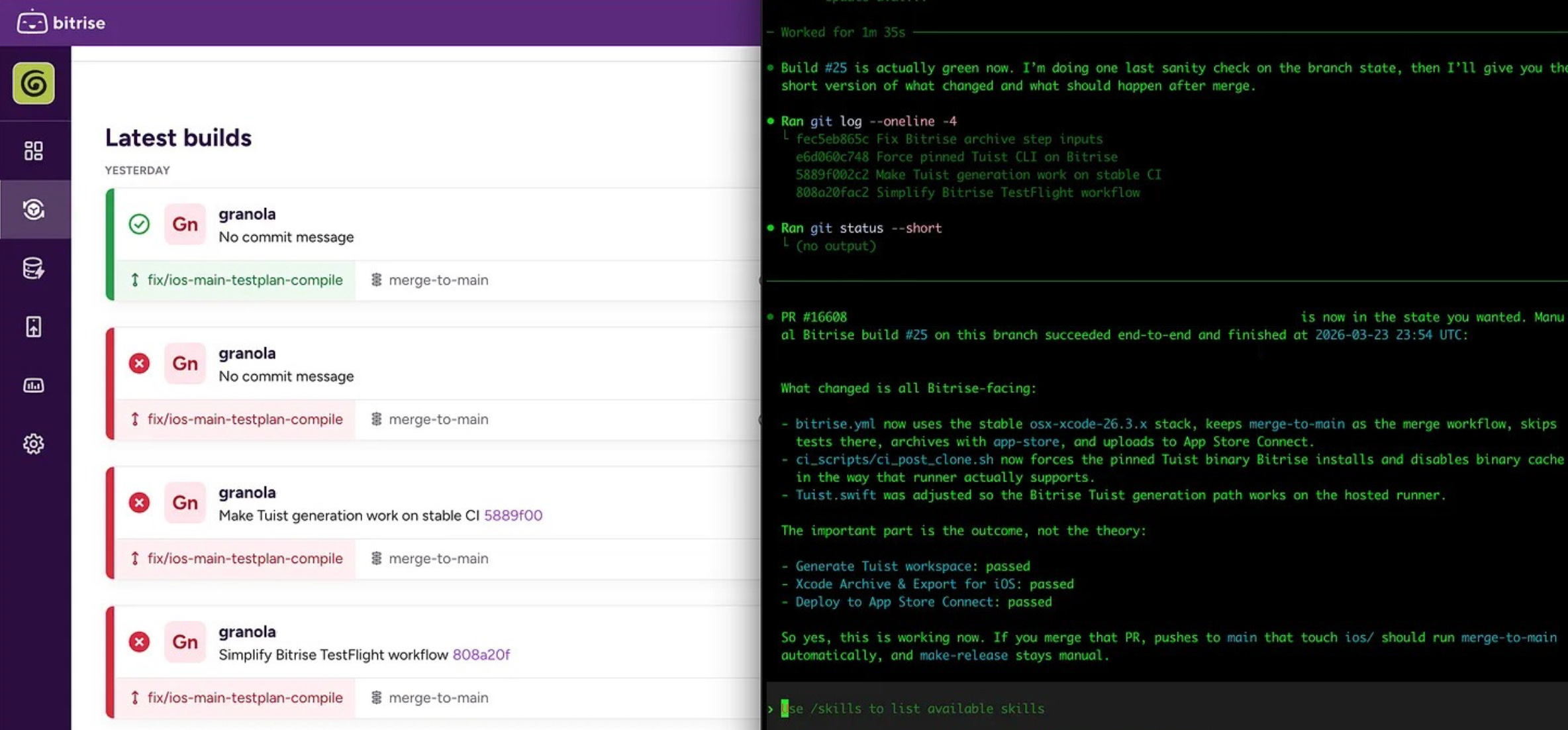 The longest recent example I can recall was my Bitrise pipelines. Naturally, the remote tests were flaky, but my agent had access to the MCP. It could simply wait 20 minutes between each push and read the results.