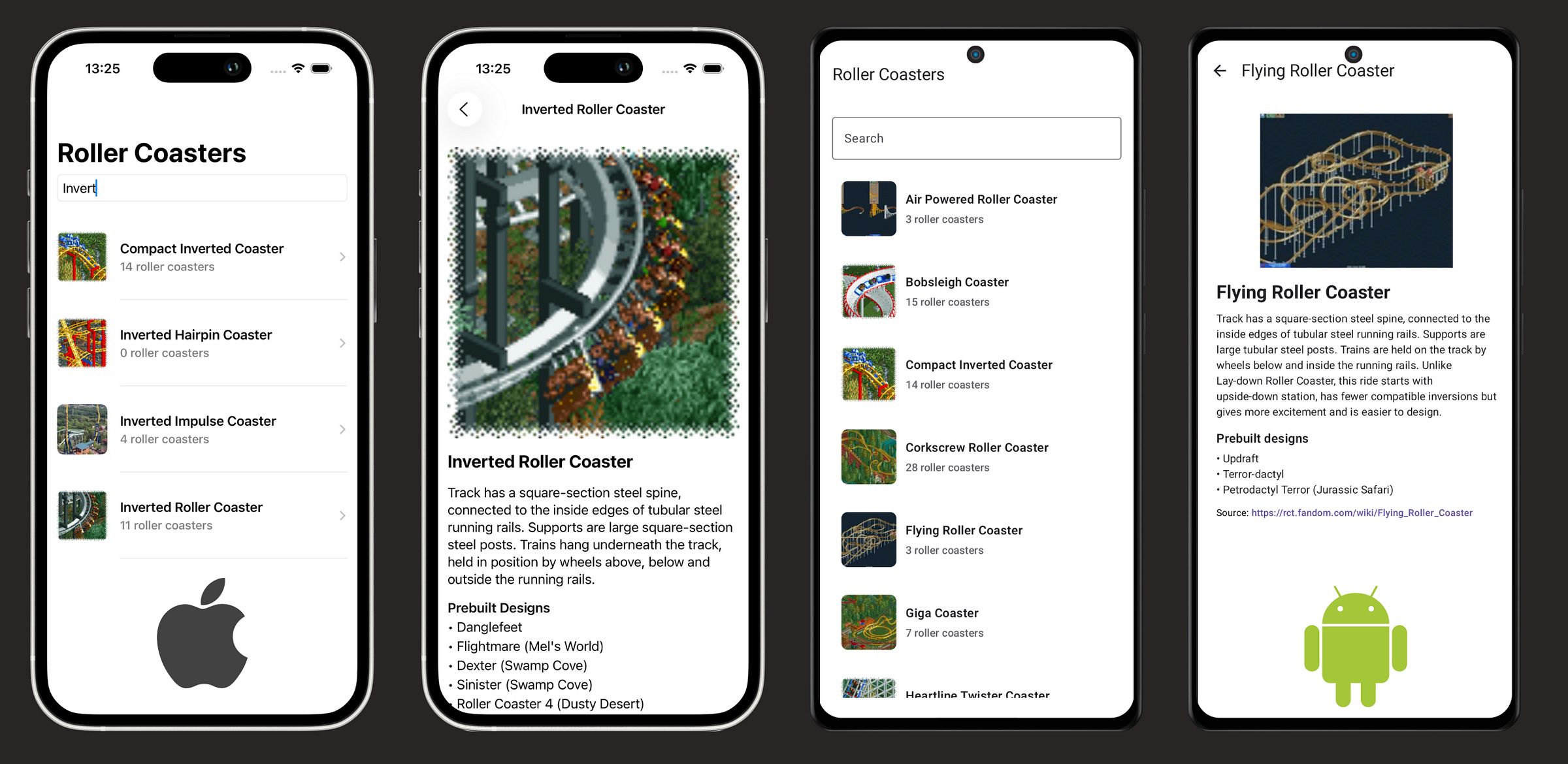 Now that I have nothing better to do with my time, I spent the week playing with Swift for Android, and KMP, setting up a pair of cross-platform apps based on Rollercoaster Tycoon 2. Swift for Android powers the Android app (with Jetpack Compose), and KMP powers the iOS app (with SwiftUI).
