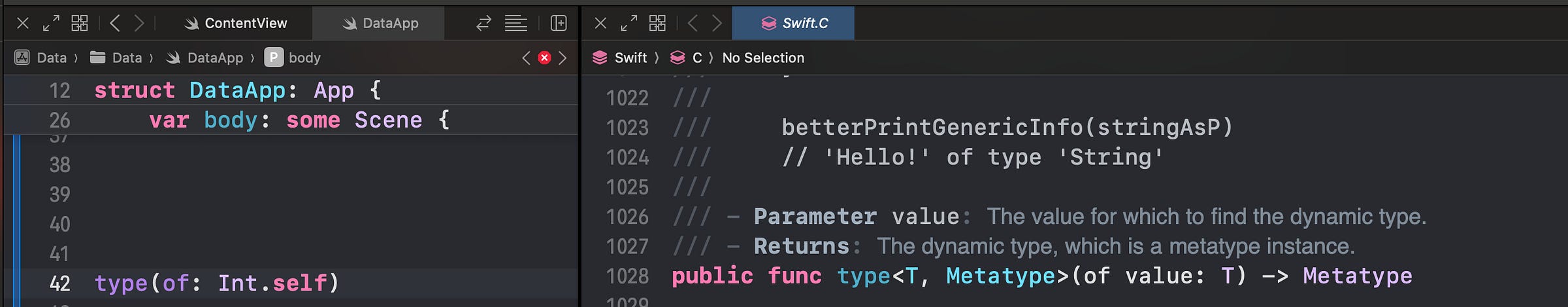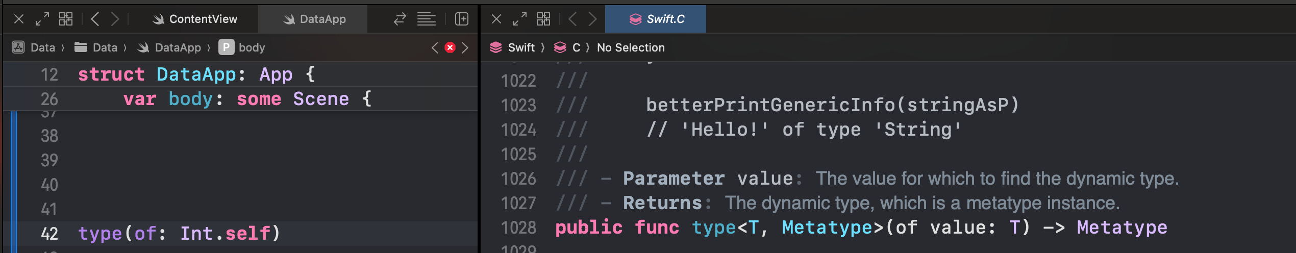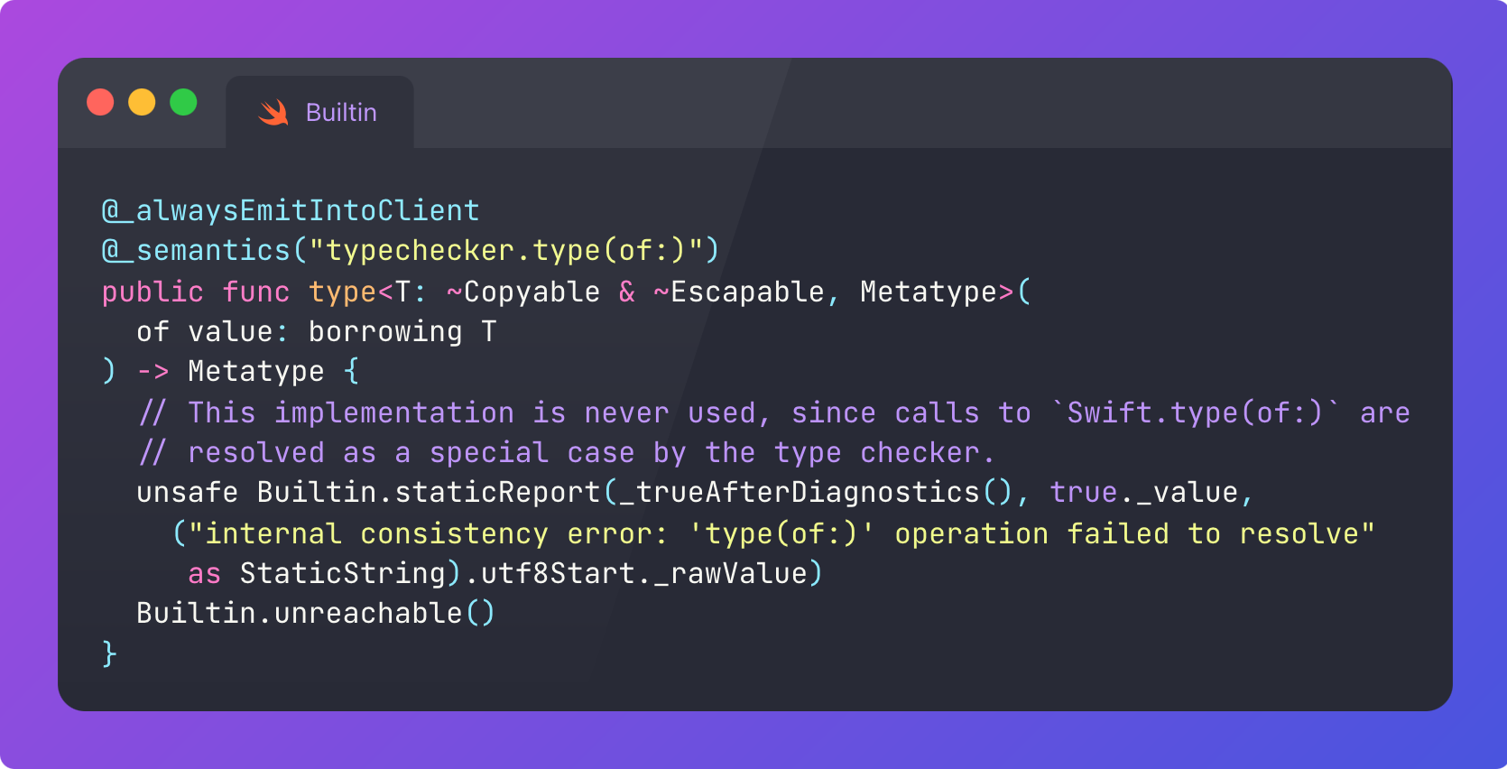We need a north star, something to hunt down as we traverse the layers of Swiftās internals. So today, weāre also going to find out precisely how the ubiquitous type(of:) function is implemented under the hood.