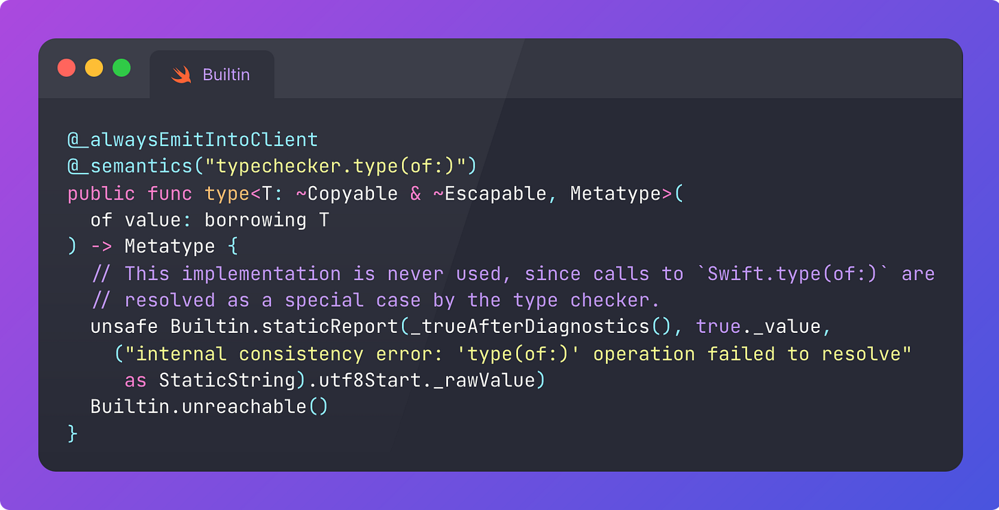 type(of:) is resolved by āa special case in the Swift type checkerā. Letās head down into the compiler to see what this meansā¦