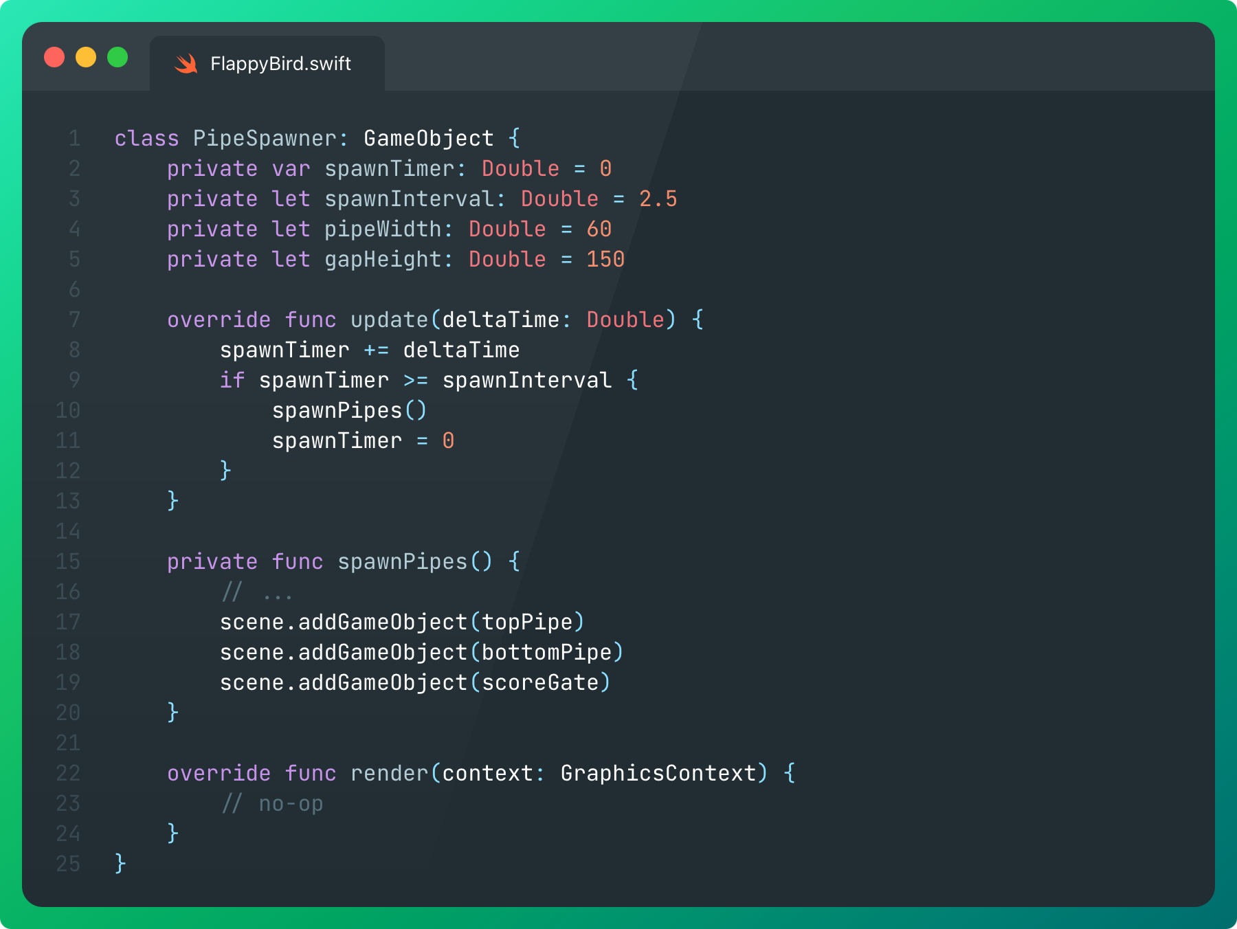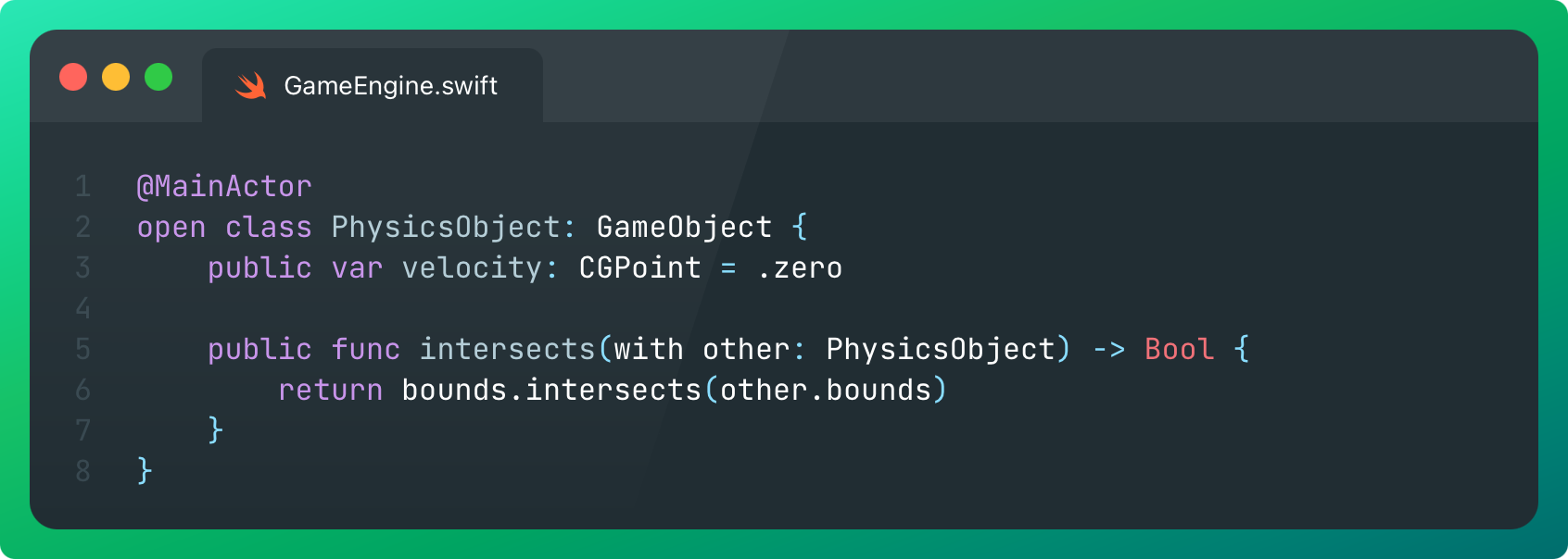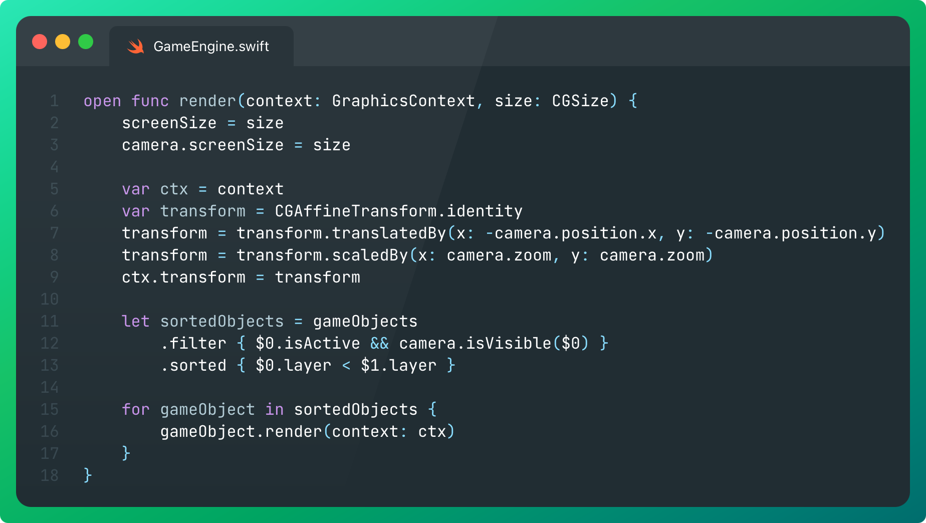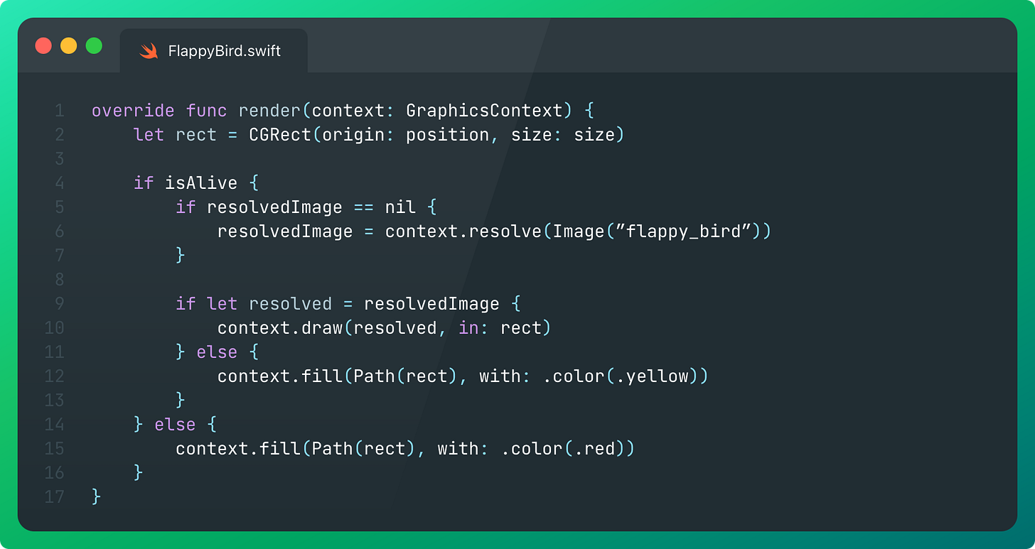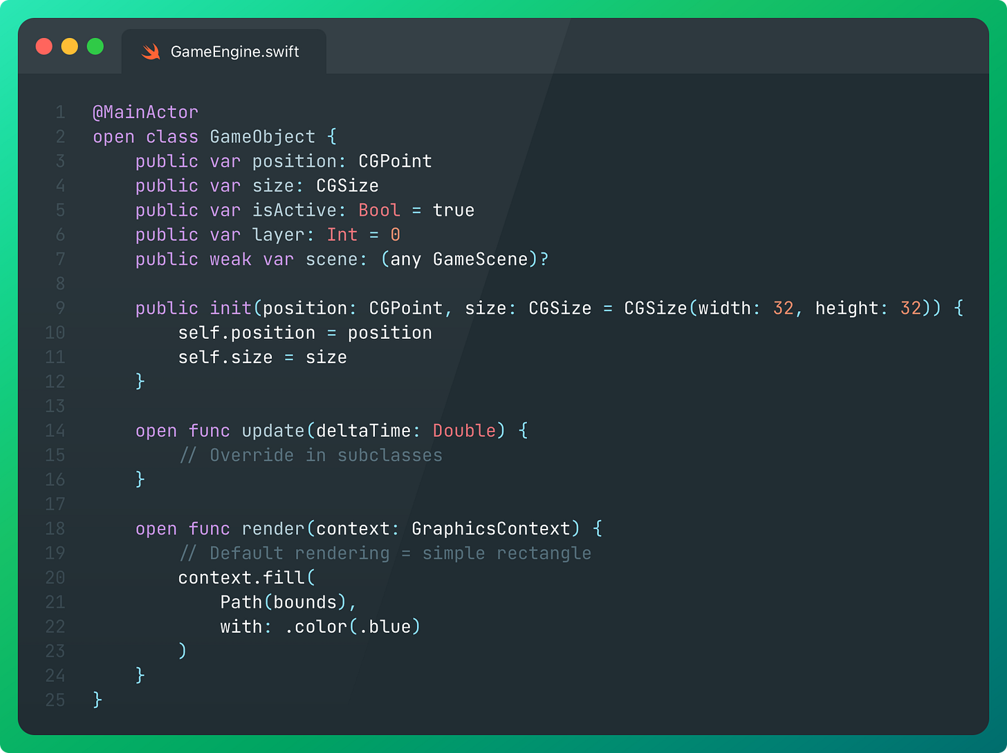 Everything visible will be drawn on-screen. The render() function takes the GraphicsContext created in the Canvas to draw the GameObject directly onto the Canvas using SwiftUI drawing APIs. You can subclass with a more complex Path, a gradient, or even a sprite from your asset catalog.