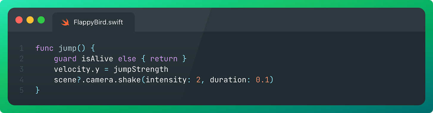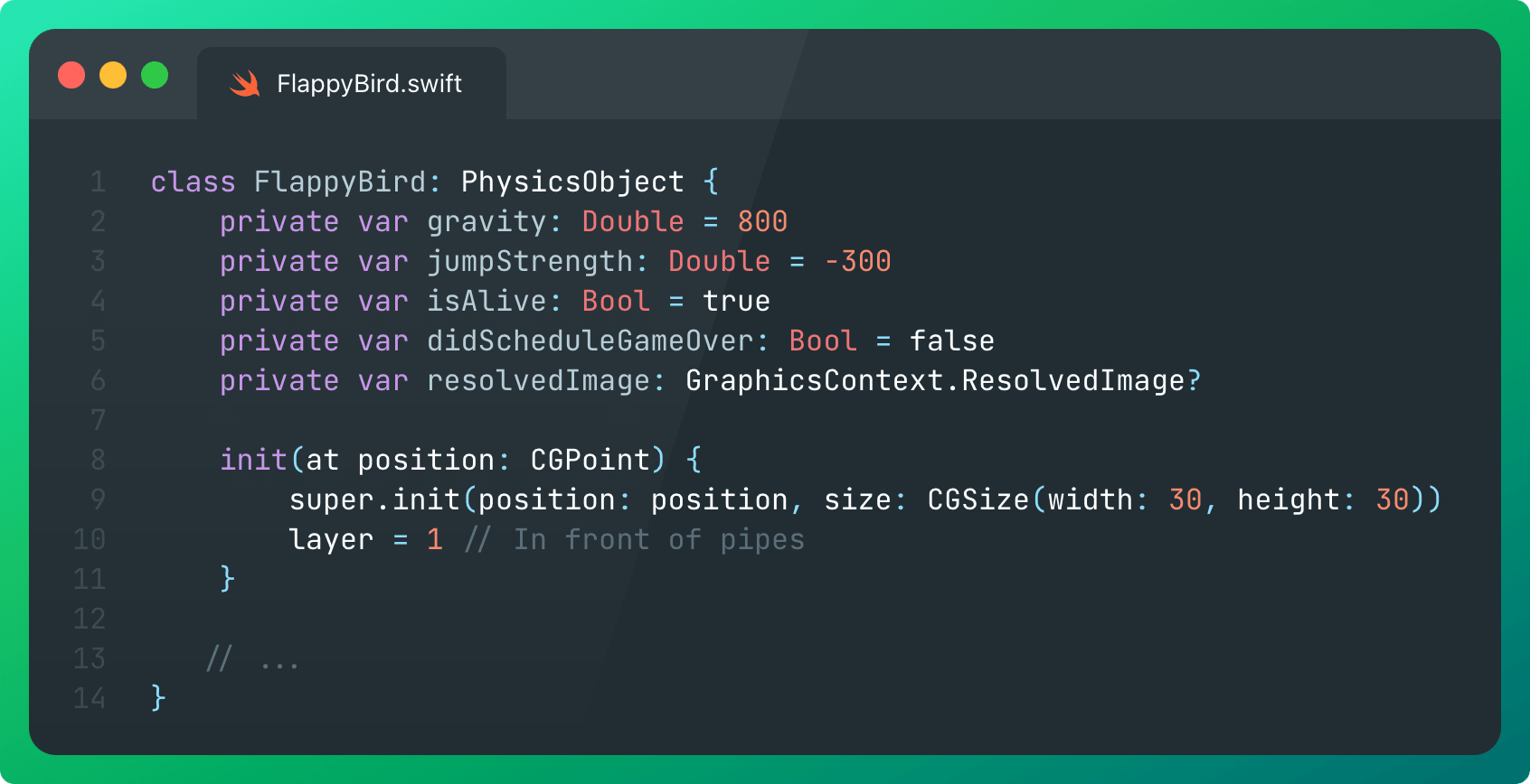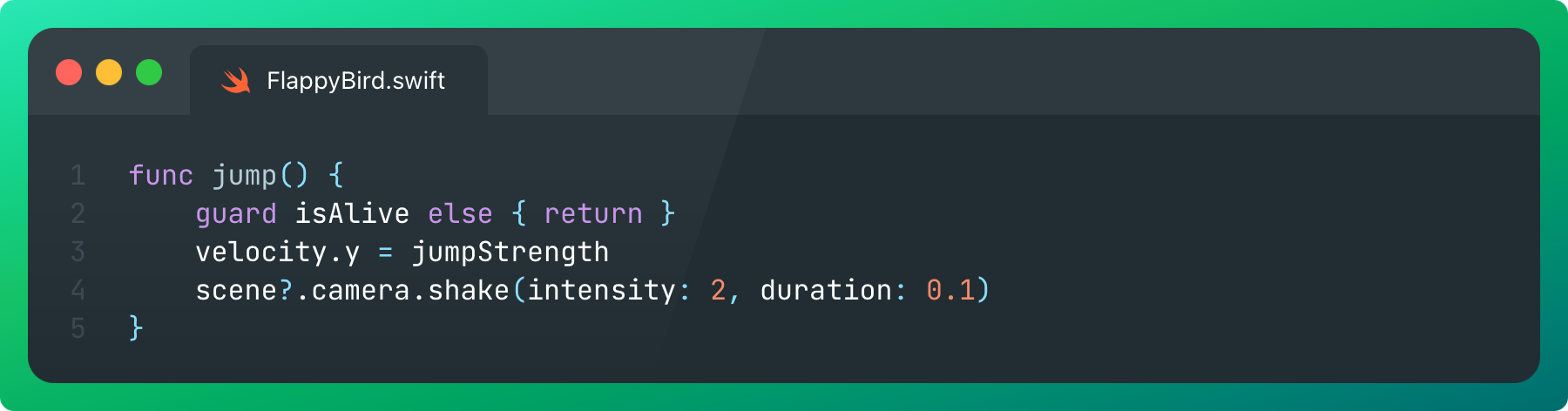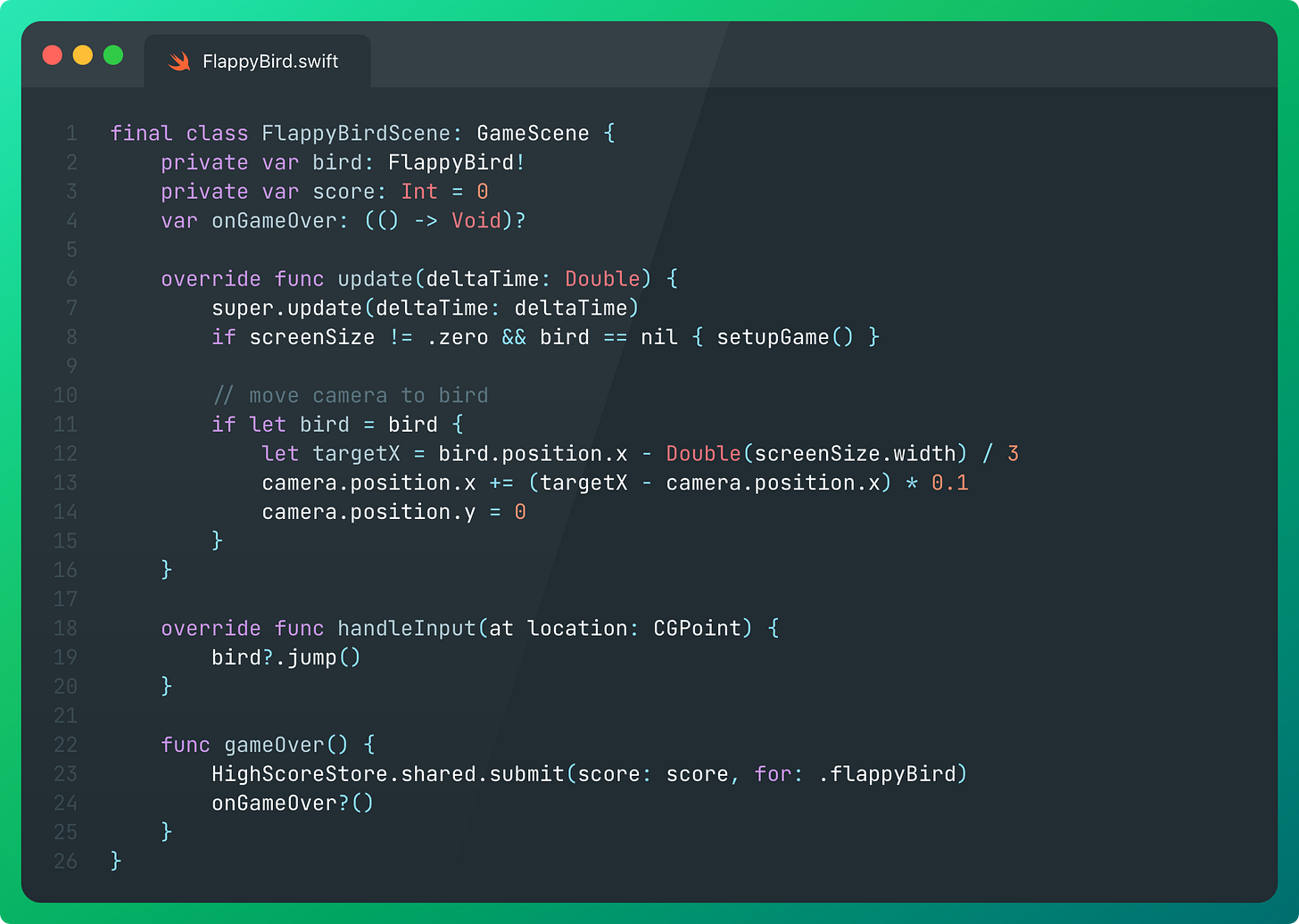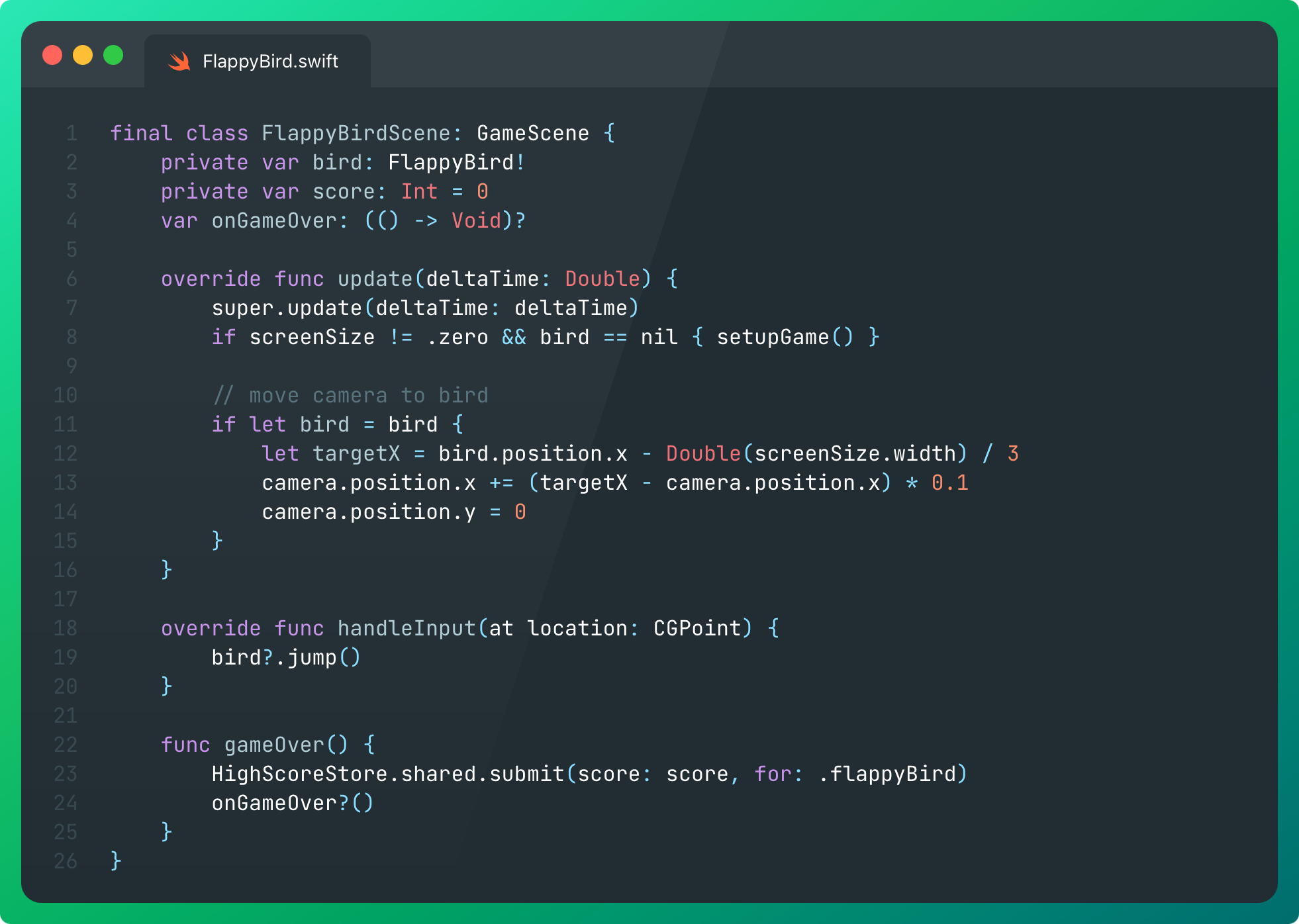 The update() method follows the bird with the camera. When the user taps anywhere, the bird jumps. Our scene also has a couple of closures that forward game states like game over and high scores to the parent views.