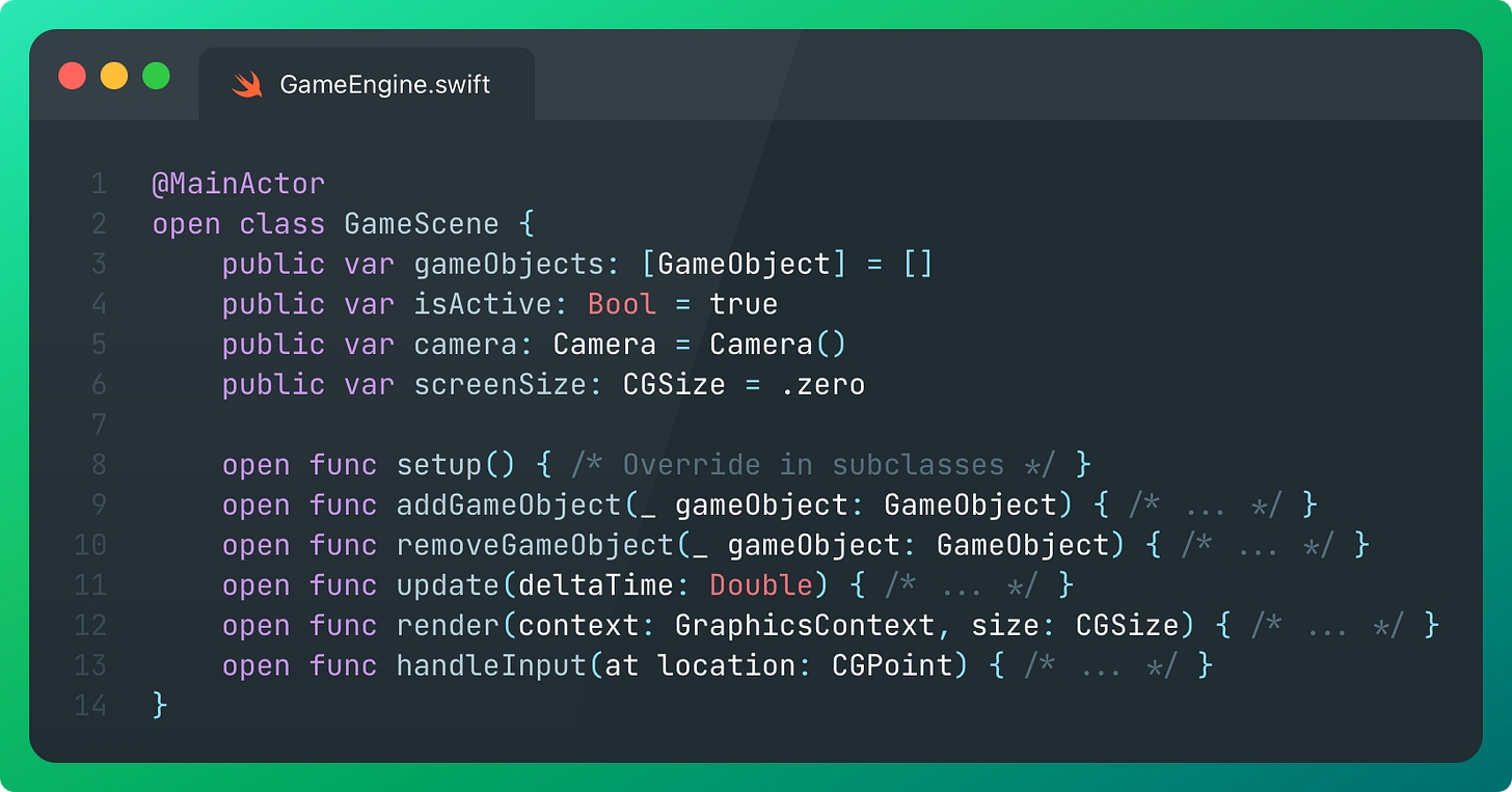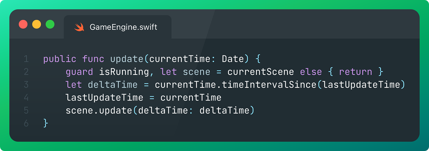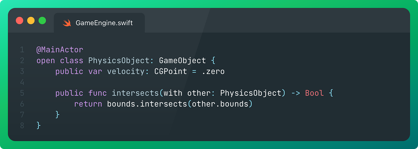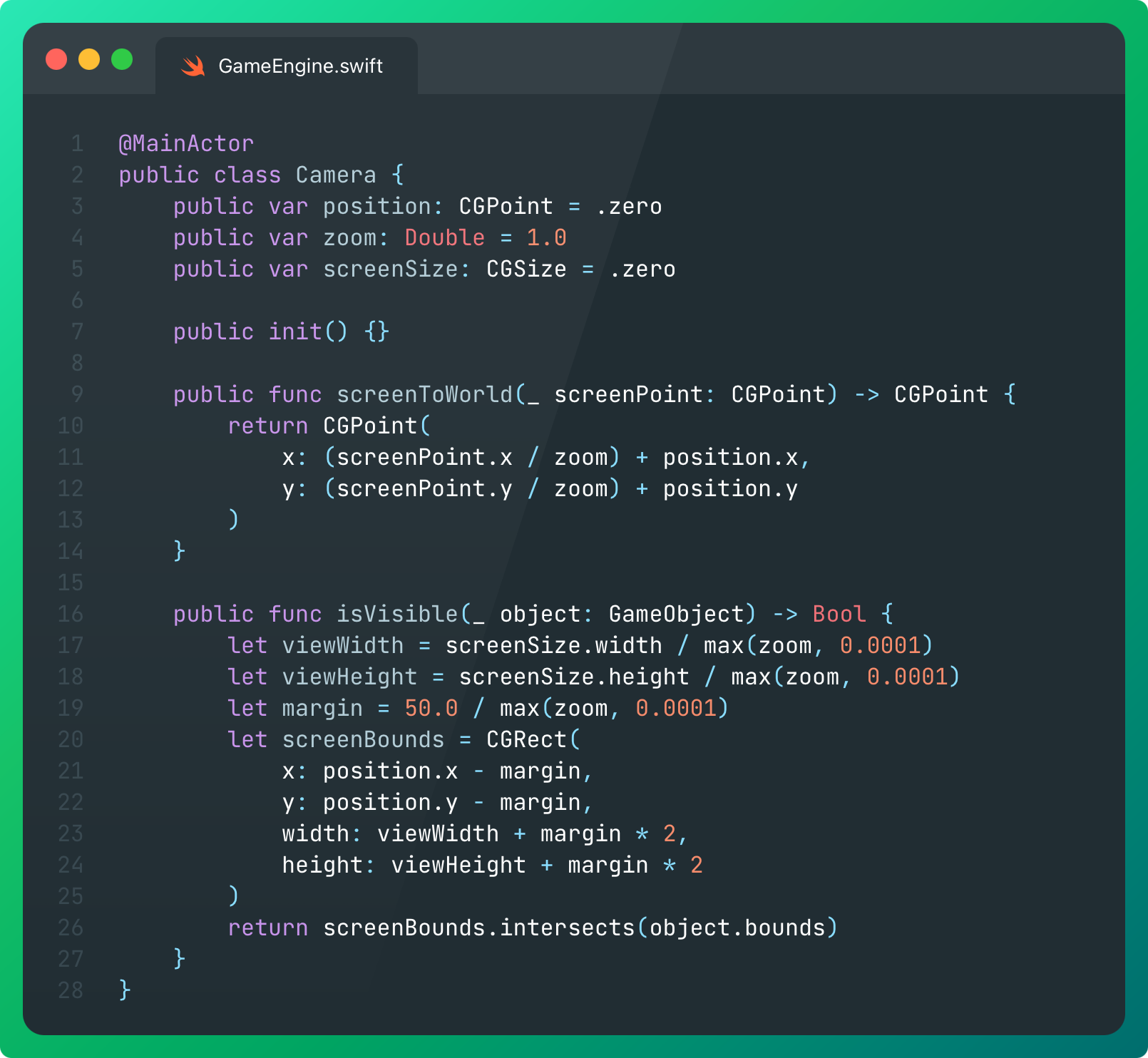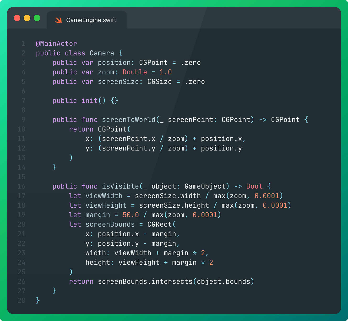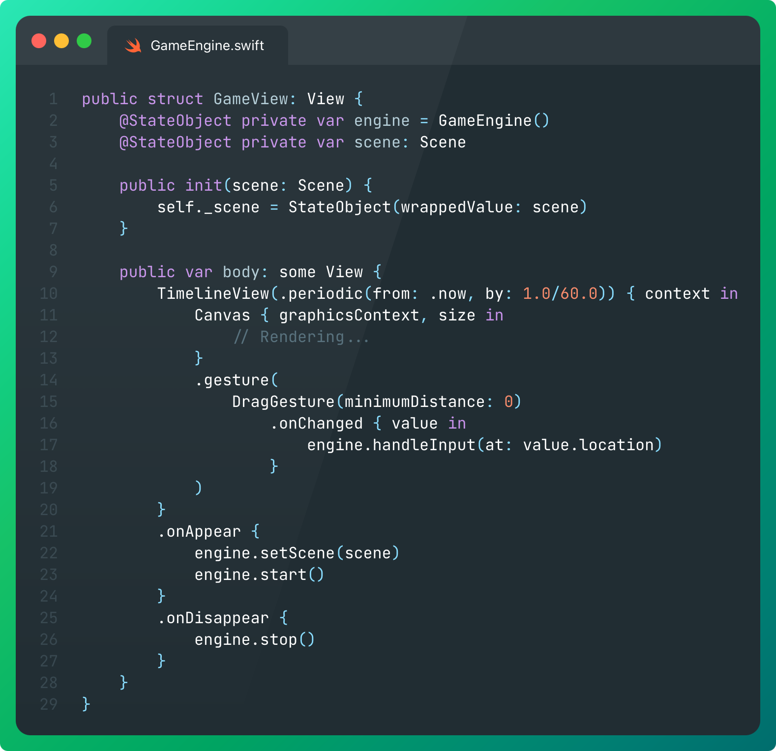The engine optimises memory via the scene, determines what is rendered using the camera, and implements physics and collision detection. The tooling within SwiftUI, specifically TimelineView and Canvas, is a surprisingly ideal fit for these requirements.
