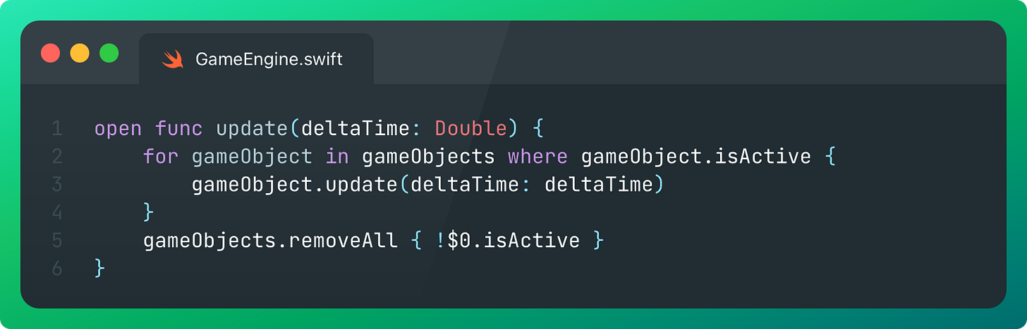 For every logical game tick, in every frame, the scene iterates through each active object and updates them. After this, it removes any game object that marked itself as inactive. This ensures that a game object that’s no longer used cleans itself up and won’t waste clock cycles any longer than required,