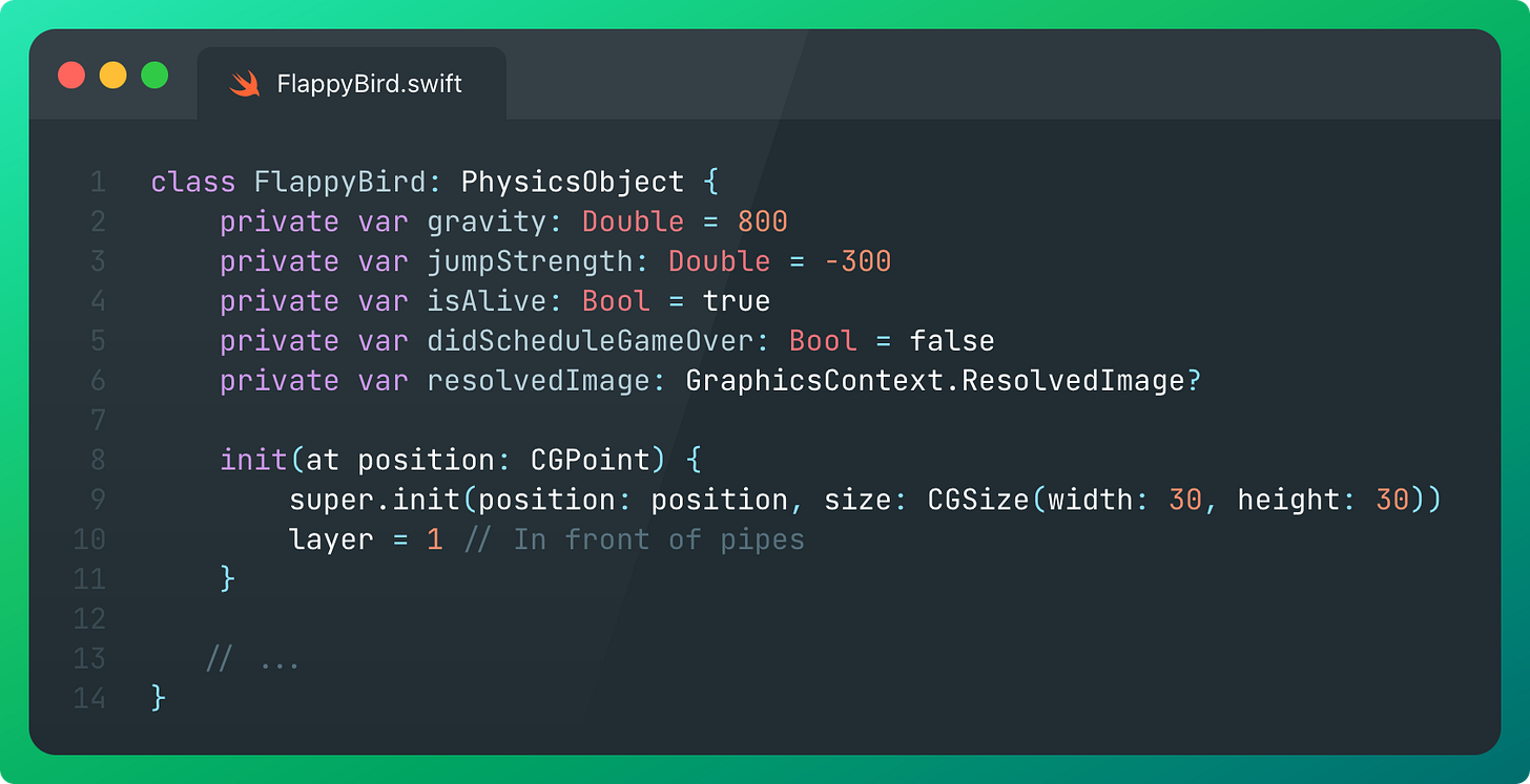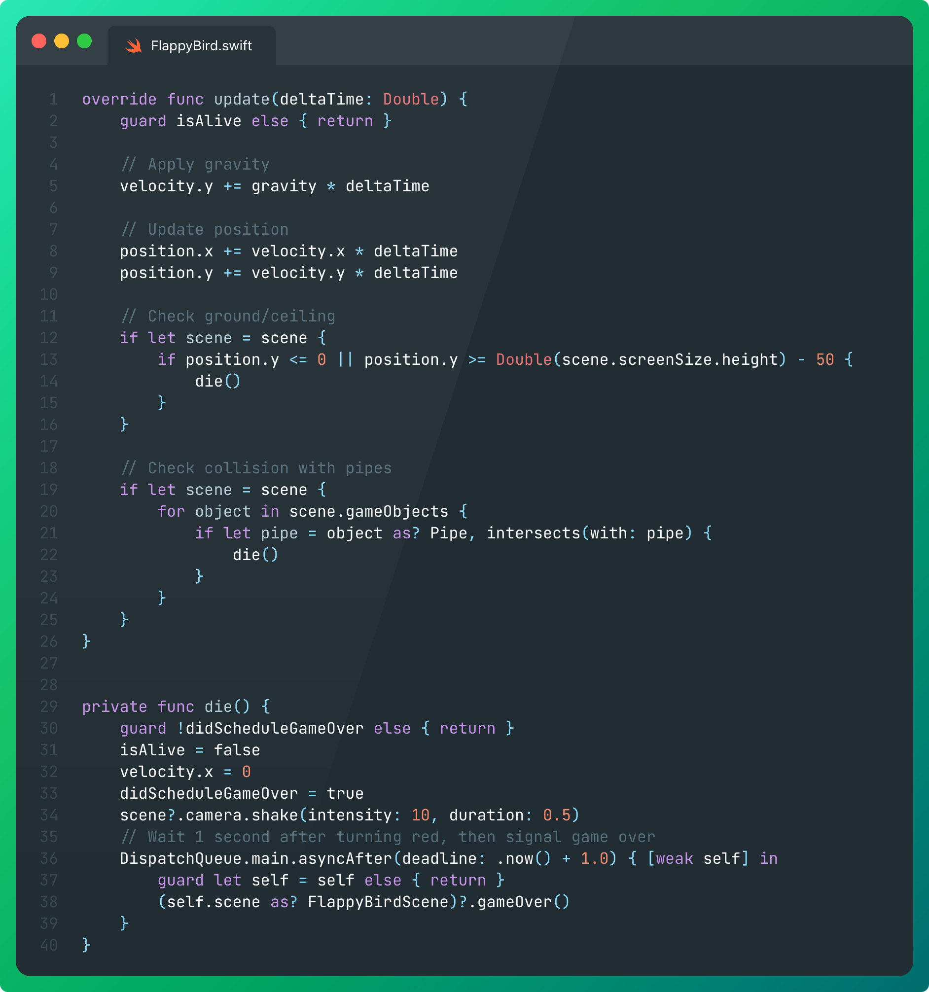 Every frame, gravity accelerates our velocity down to the ground. The bird’s position per tick updates based on velocity. We check if the bird collides with obstacles and dies.