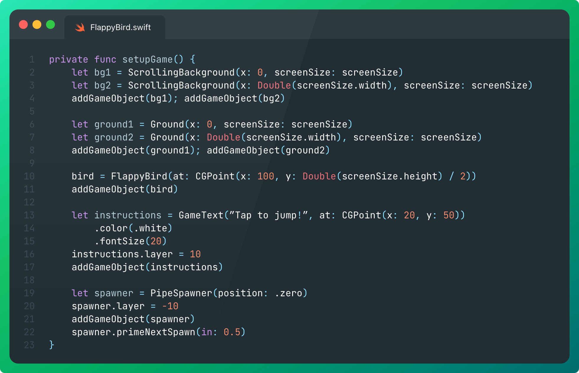setupGame() is the most important method, pulling all our game objects together. It creates scrolling backgrounds, ground objects, the bird, instructions text, and a pipe spawner.