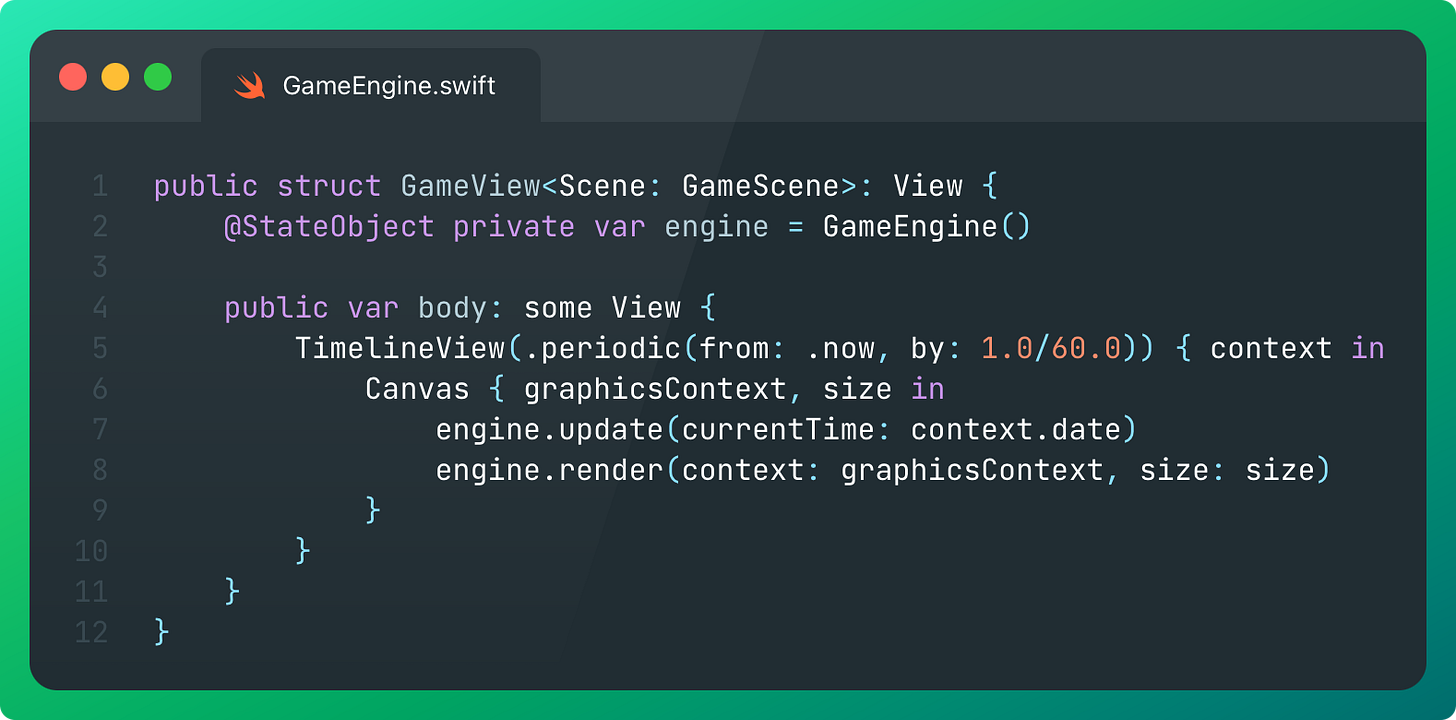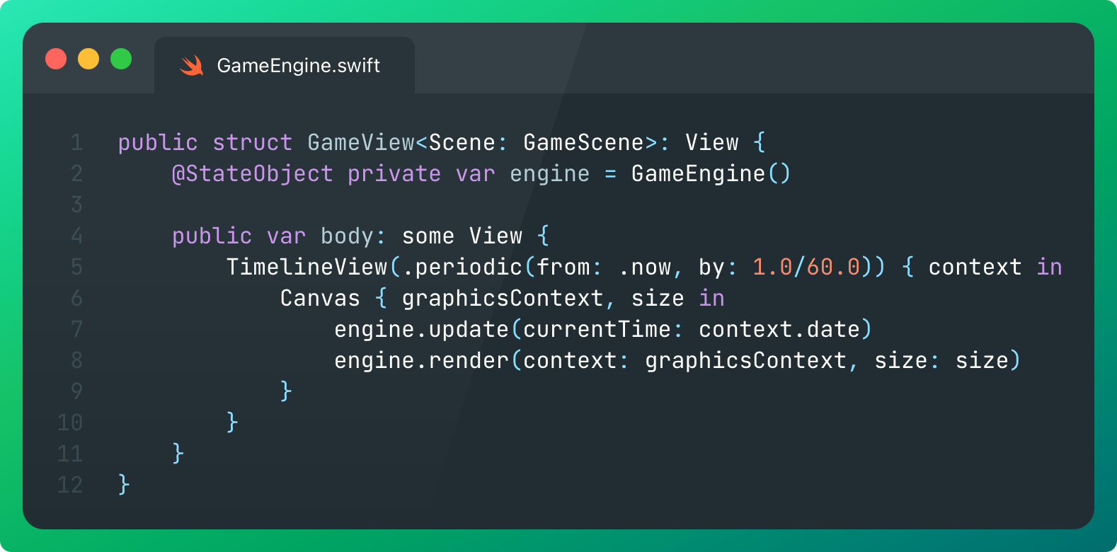 If you didn’t think SwiftUI was already a great fit, we can wrap our Canvas in a TimelineView that ticks every 1/60 of a second, and lock in a buttery 60fps for our game loop.