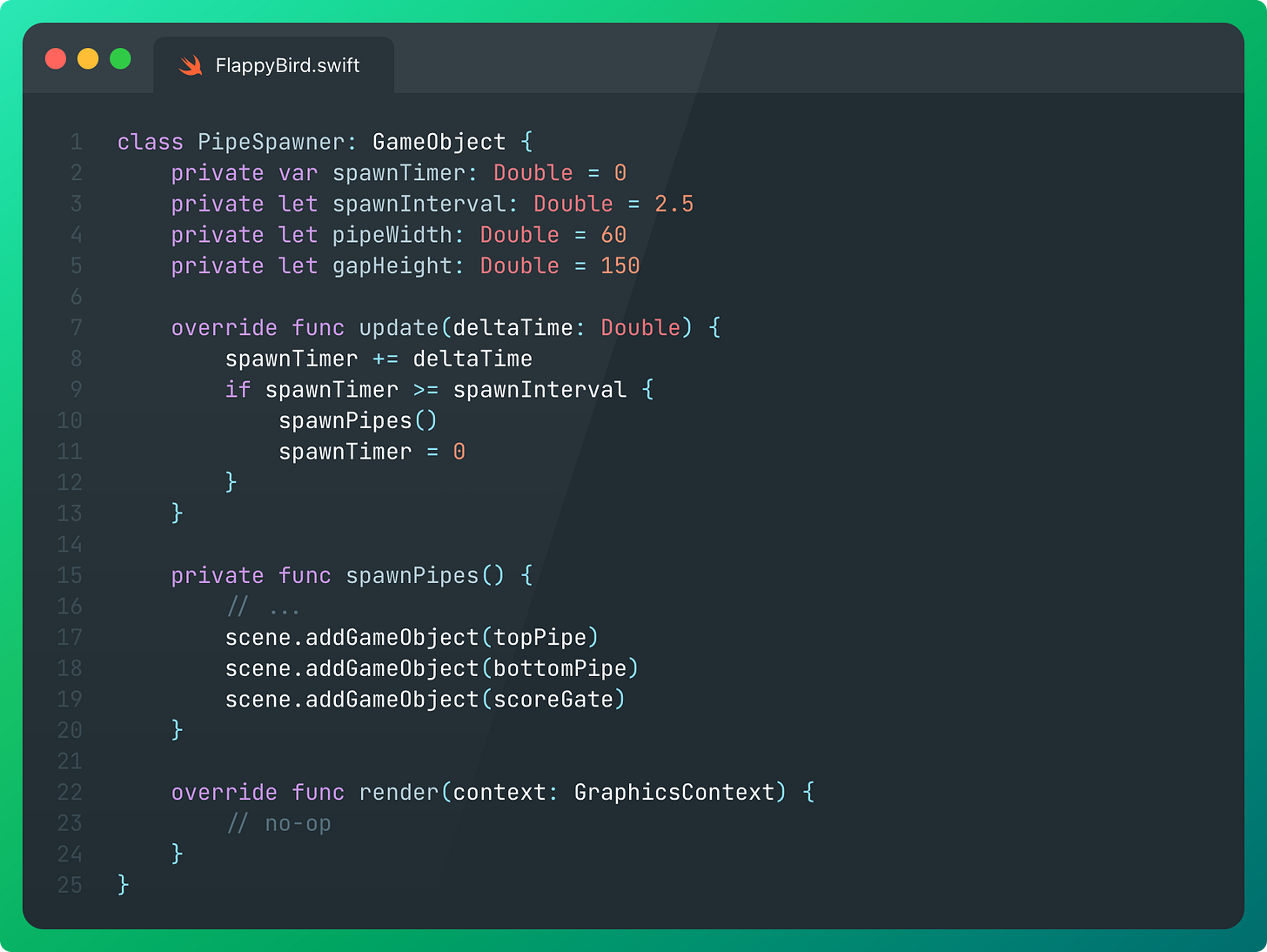 We also have an invisible “pipe spawner” object that generates these obstacles and scoring gates periodically: