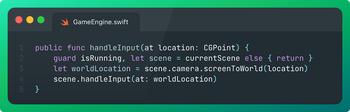 DragGesture(minimumDistance: 0) is used here instead of a tap gesture because this allows us to continuously stream the user’s finger position each game tick. This takes a complex range of potential inputs and condenses them into a single input, at the given location, each game tick. These gestures may be propagated down towards game objects.