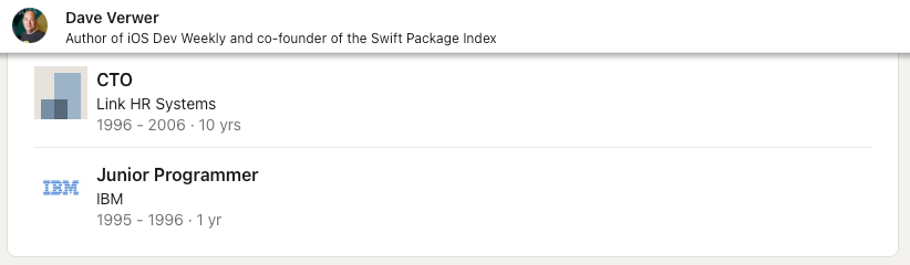 You might know him from iOS Dev Weekly, but Dave’s early career reminds me of another famous LinkedIn profile.