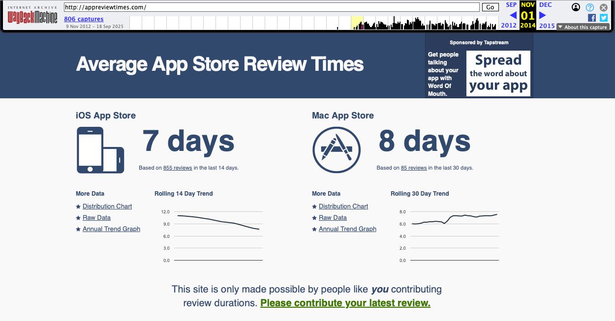 People encouraged Dave to keep the site up, lest Apple get lax with times again and they backslide. But with faster review times, fewer people checked the site, and less people Tweeted review times. Without a sufficient sample size, data grew less accurate, meaning there was no longer any reason or ability to keep the site active.