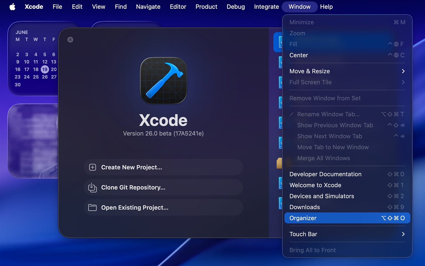 We can find the Organizer in Xcode’s Window menu.